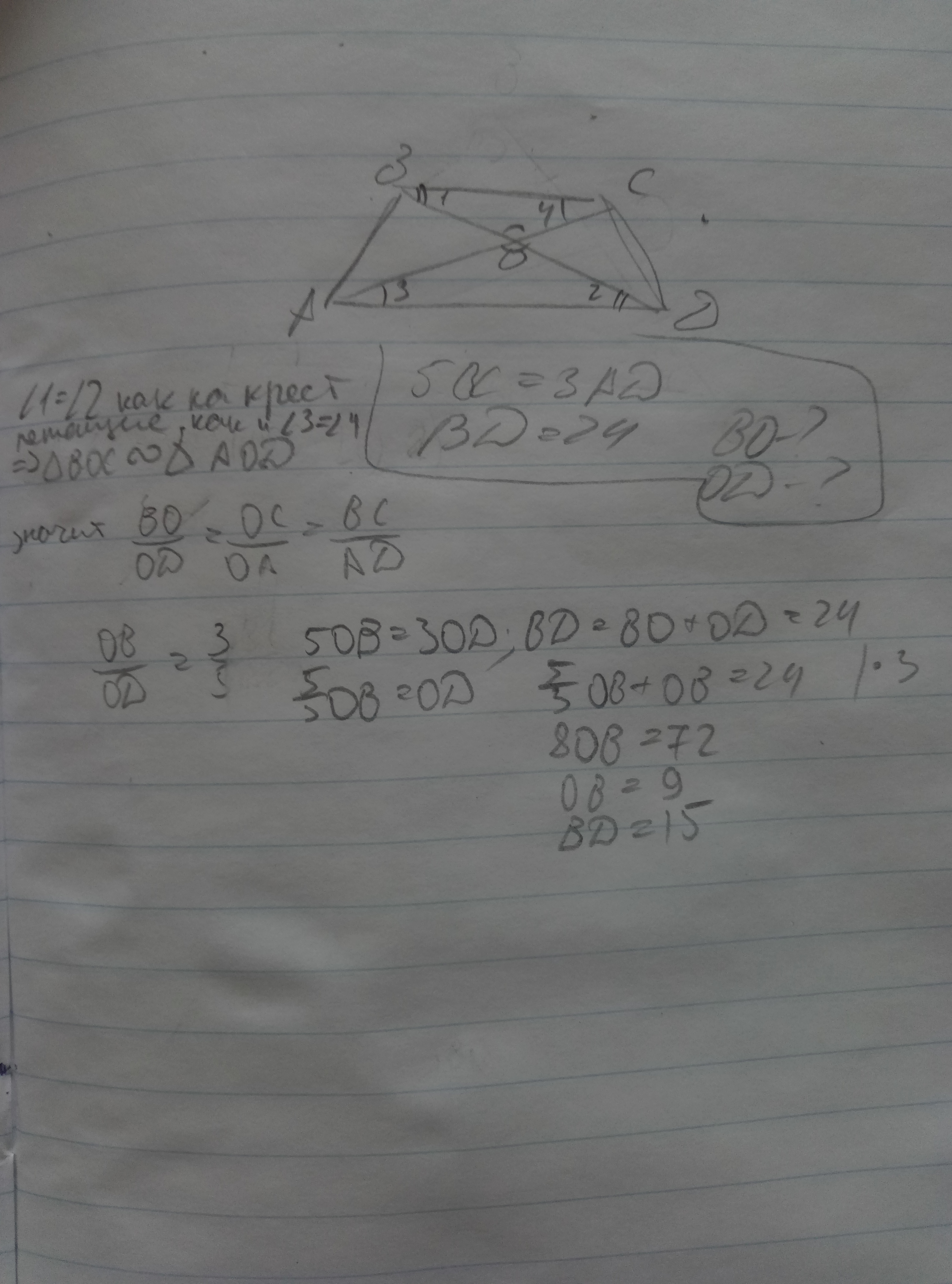 В трапеции АВСD с основанием АD и ВС диогонали пересекаются в точке О, ВС : АD = 3 : 5, BD = 24 . Найти BO и OD