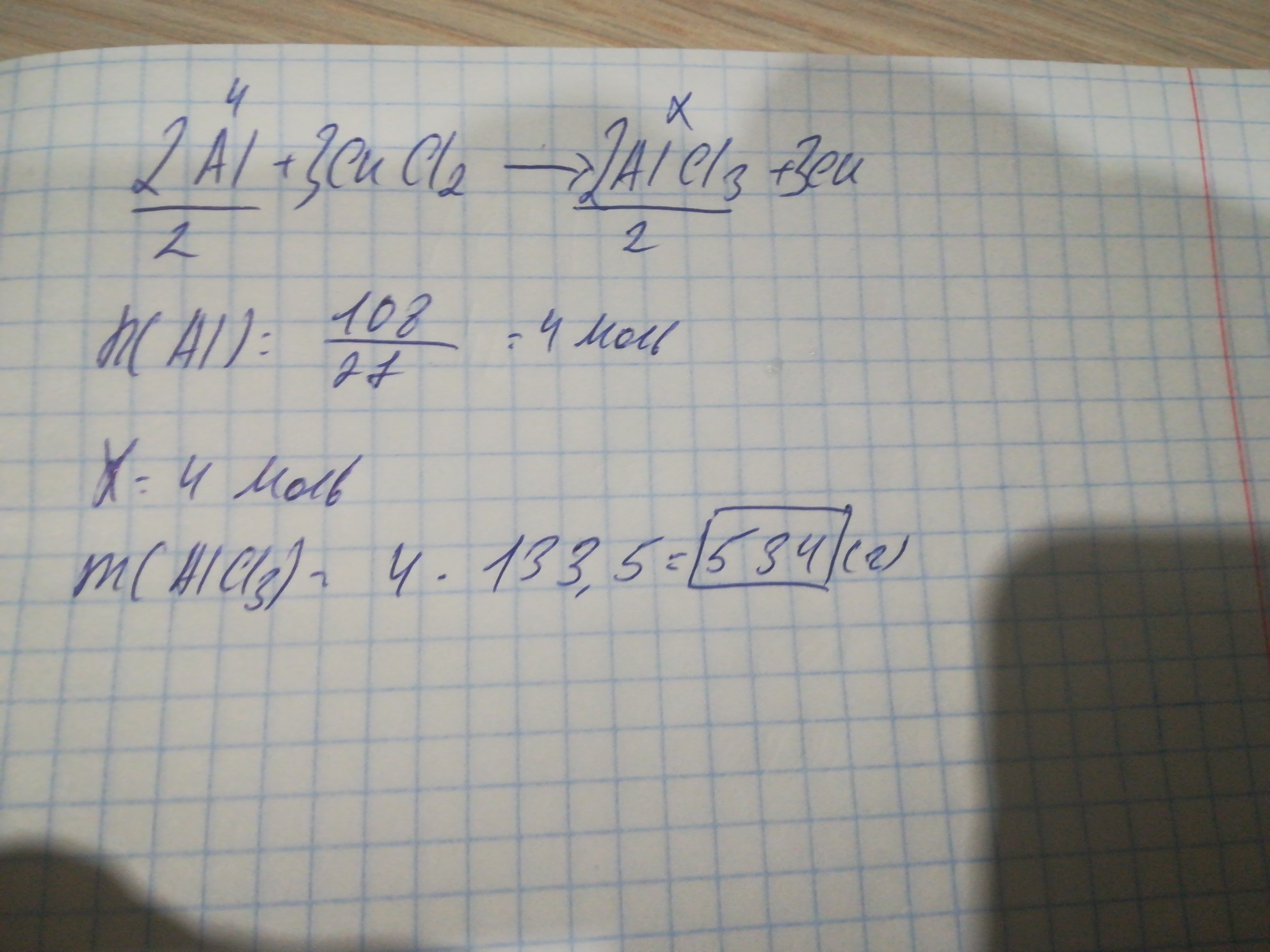 . Вычислите массу хлорида алюминия, полученного при взаимодействии алюминия массой 108 г. с хлоридом меди (2)