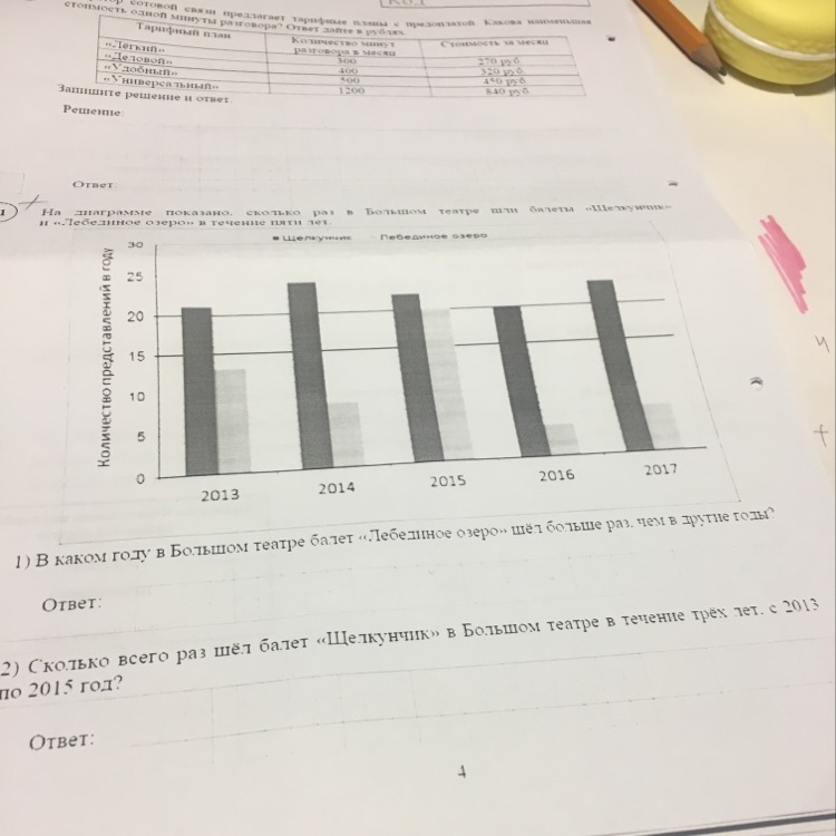 На диаграмме показано .сколько раз в Большом театре шли балеты Щелкунчик и Лебединое озеро в течение пяти лет