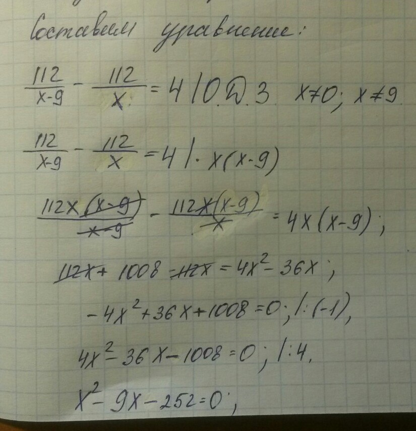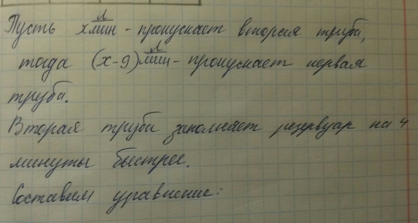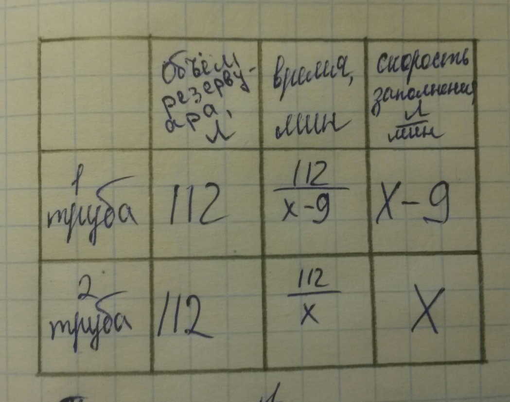 Первая труба пропускает на 9 литров воды в минуту меньше, чем вторая труба. Сколько литров воды в минуту пропускает вторая труба, если резервуар объёмом 112 литров она заполняет на 4 минуты быстрее, чем первая труба?