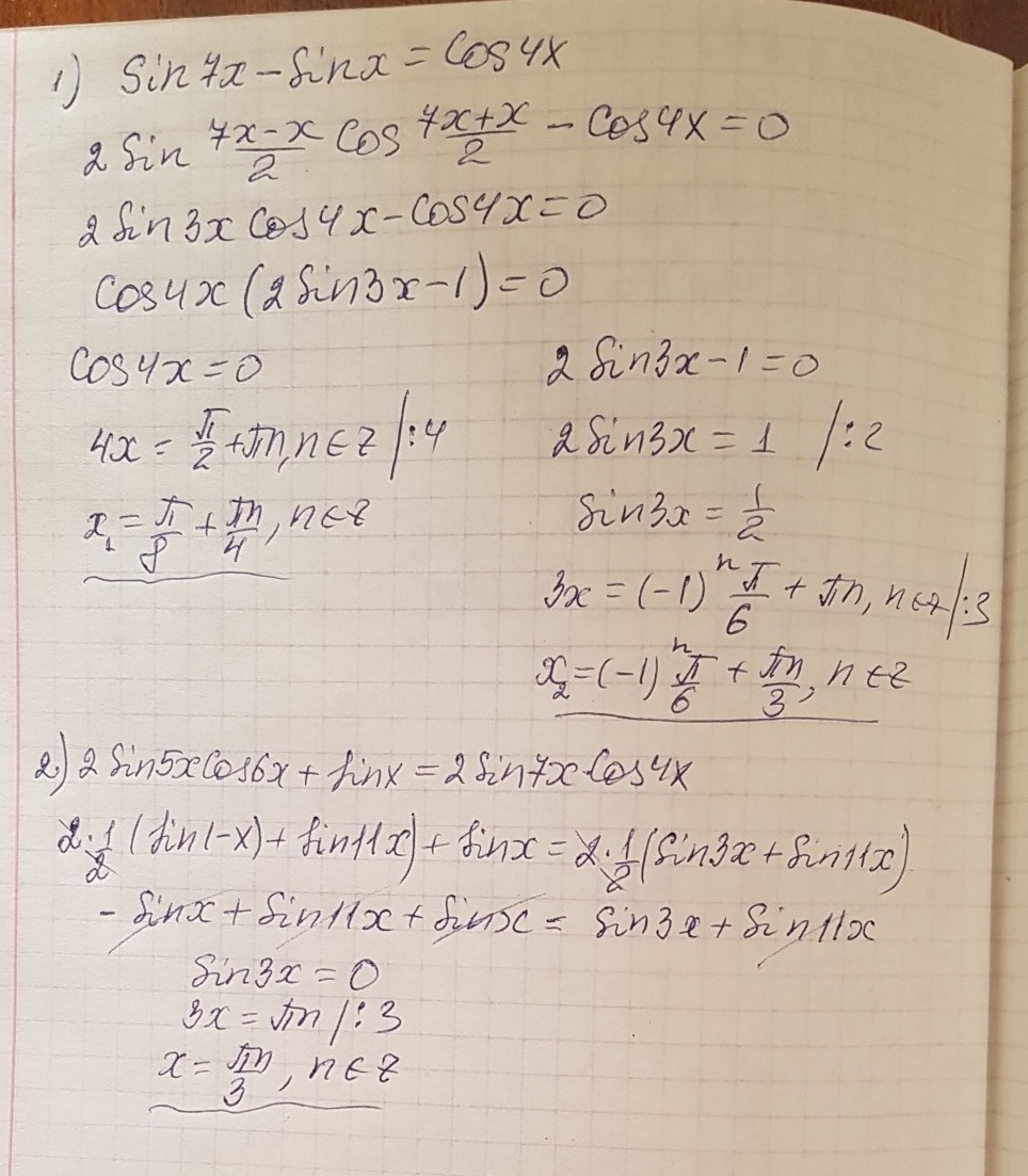 31б.Помогите очень прошу, очень нужно!!!!!!!Срочно!!Методом розкладання на множники .Розвяжіть рівняння:1)sin7x-sinx=cos4x
