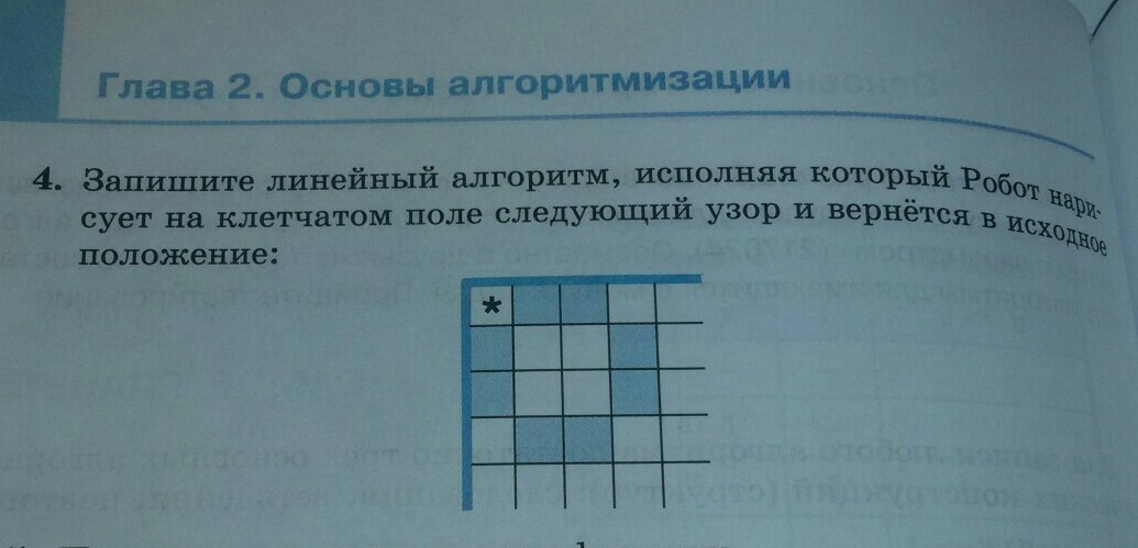 Информатика 8 класс Босова стр.92 #4. Запишите линейный алгоритм, исполяя который Робот нарисует на клетчатрм поле следующий узор и вернется в исходное положение
