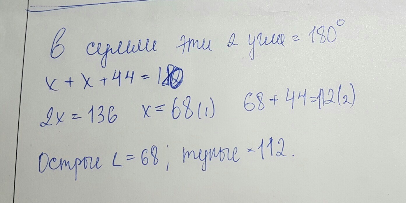 две параллельные прямые пересечены секущей. Разность двух из восьми образовавшихся углов равна 44° . Найдите каждый из восьми углов