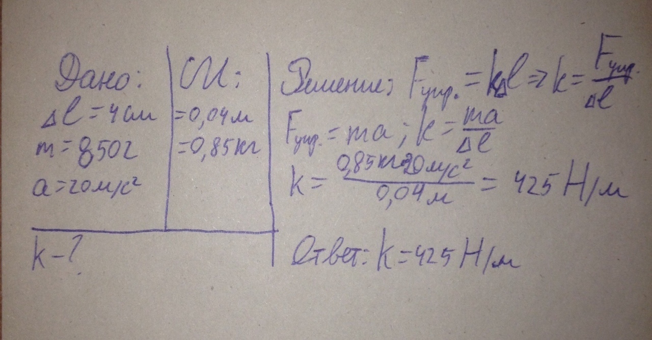- Чему равна жесткость пружины, если груз массой 850 г сместился на 4 см, а ускорение 20 м/с2 ?