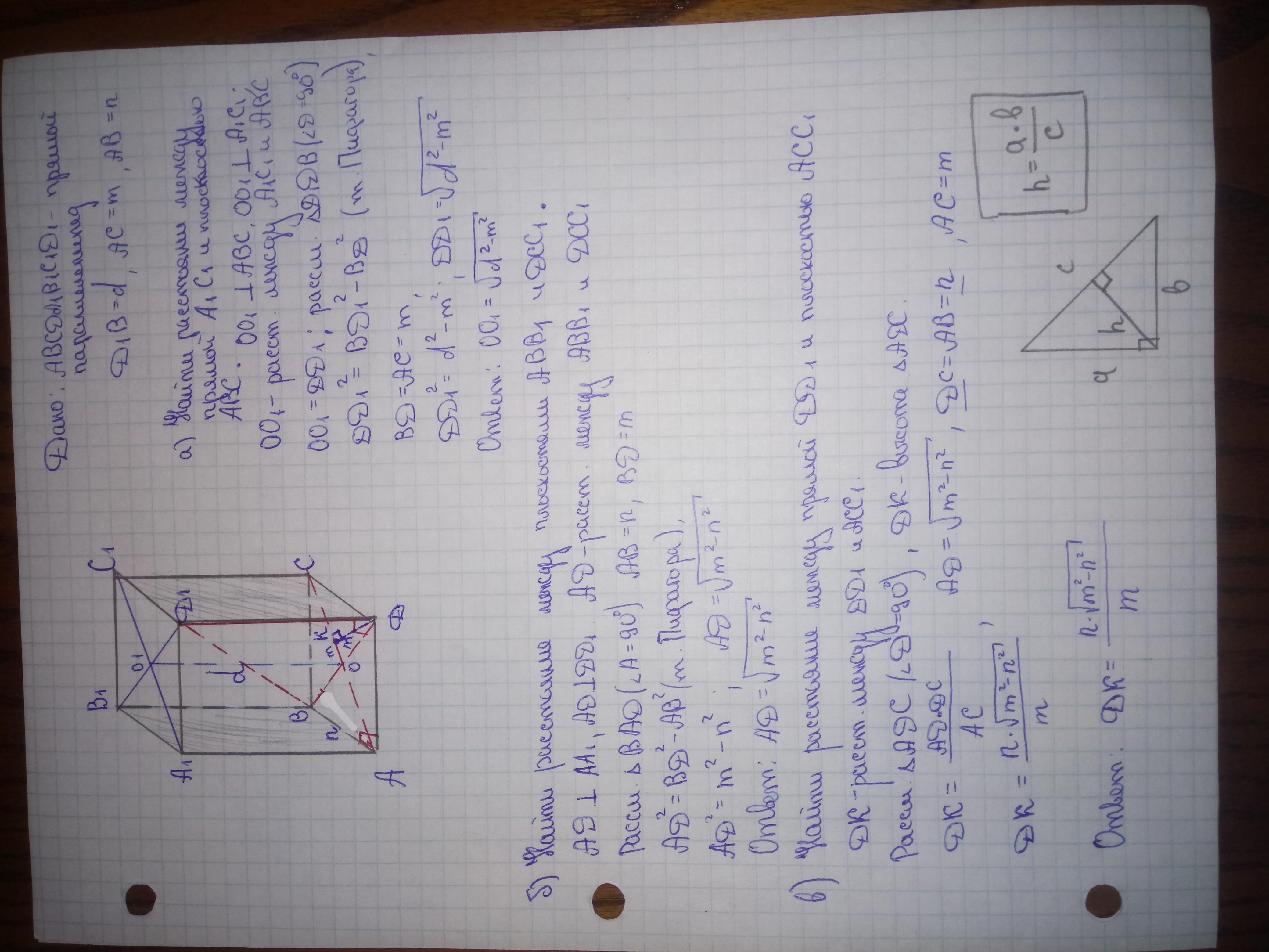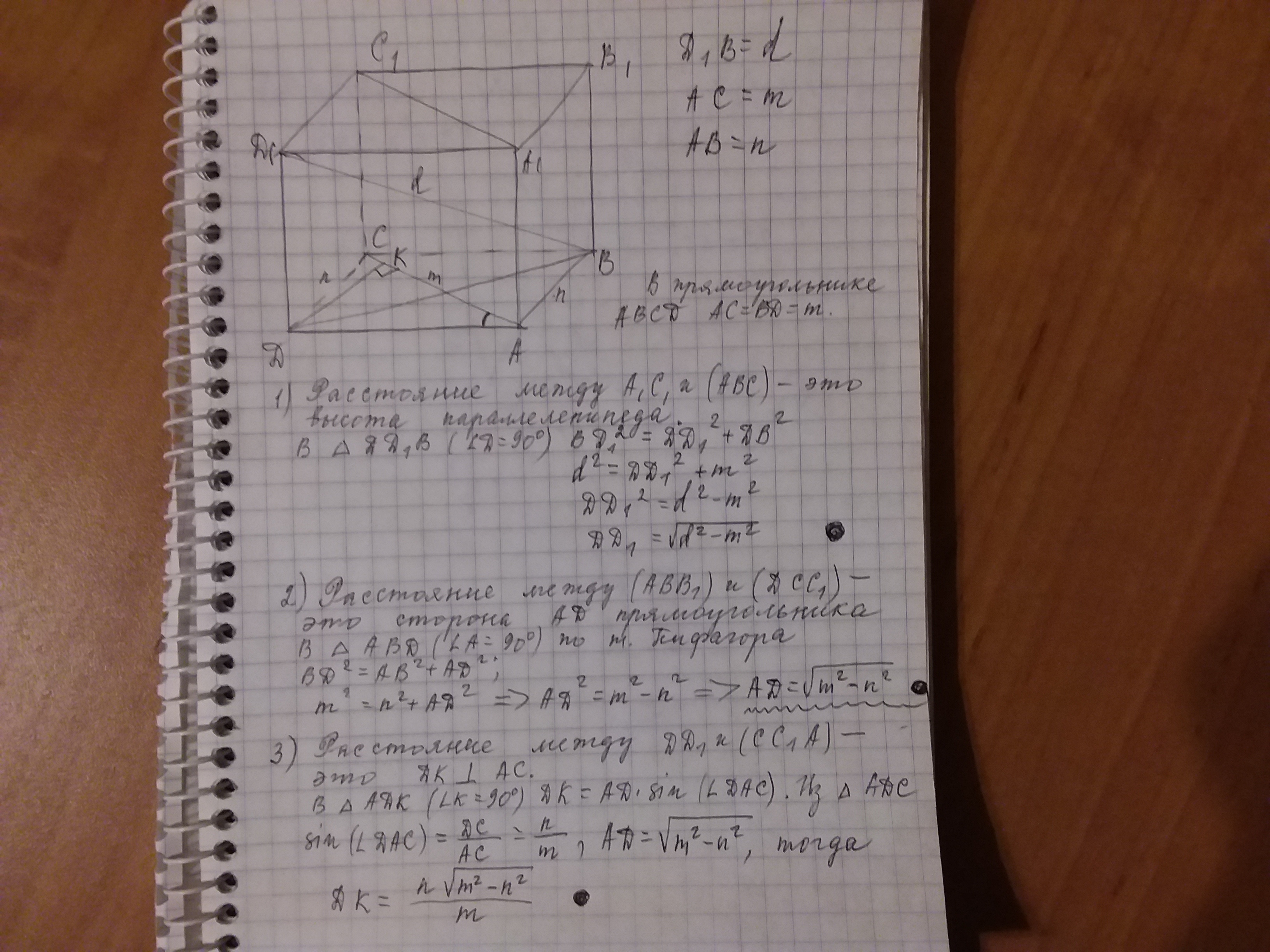 В прямоугольном параллелепипеде ABCDA1B1C1D1 дано: D1B = d, АС = m, АВ=n. Найдите расстояние между: а) прямой A1C1 и плоскостью ABC; б) плоскостями ABB1 и DCC1; в) прямой DD1 и плоскостью АСС1;