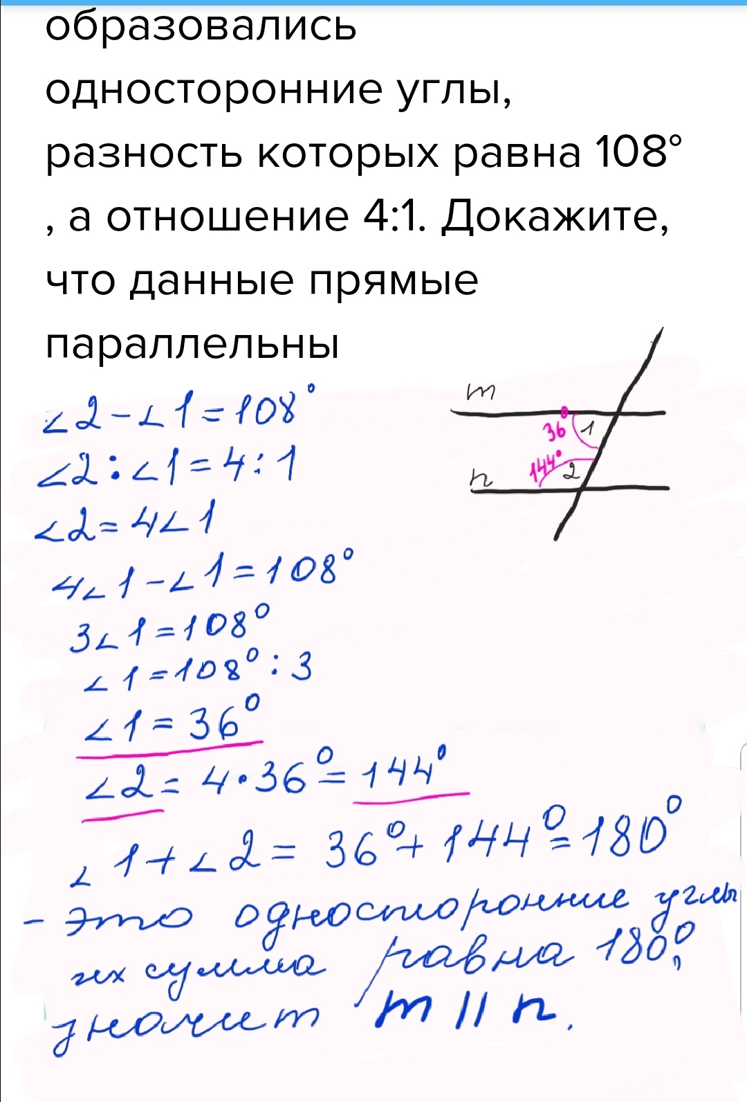 При пересеч. двух данных прямых секущей образовались односторонние углы, разность которых равна 108° , а отношение 4:1. Докажите, что данные прямые параллельны