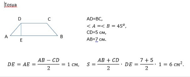Найдите площадь равнобедренной трапеции с основаниями 5 см и 7 см., если угол при большем основании равен 45 0.