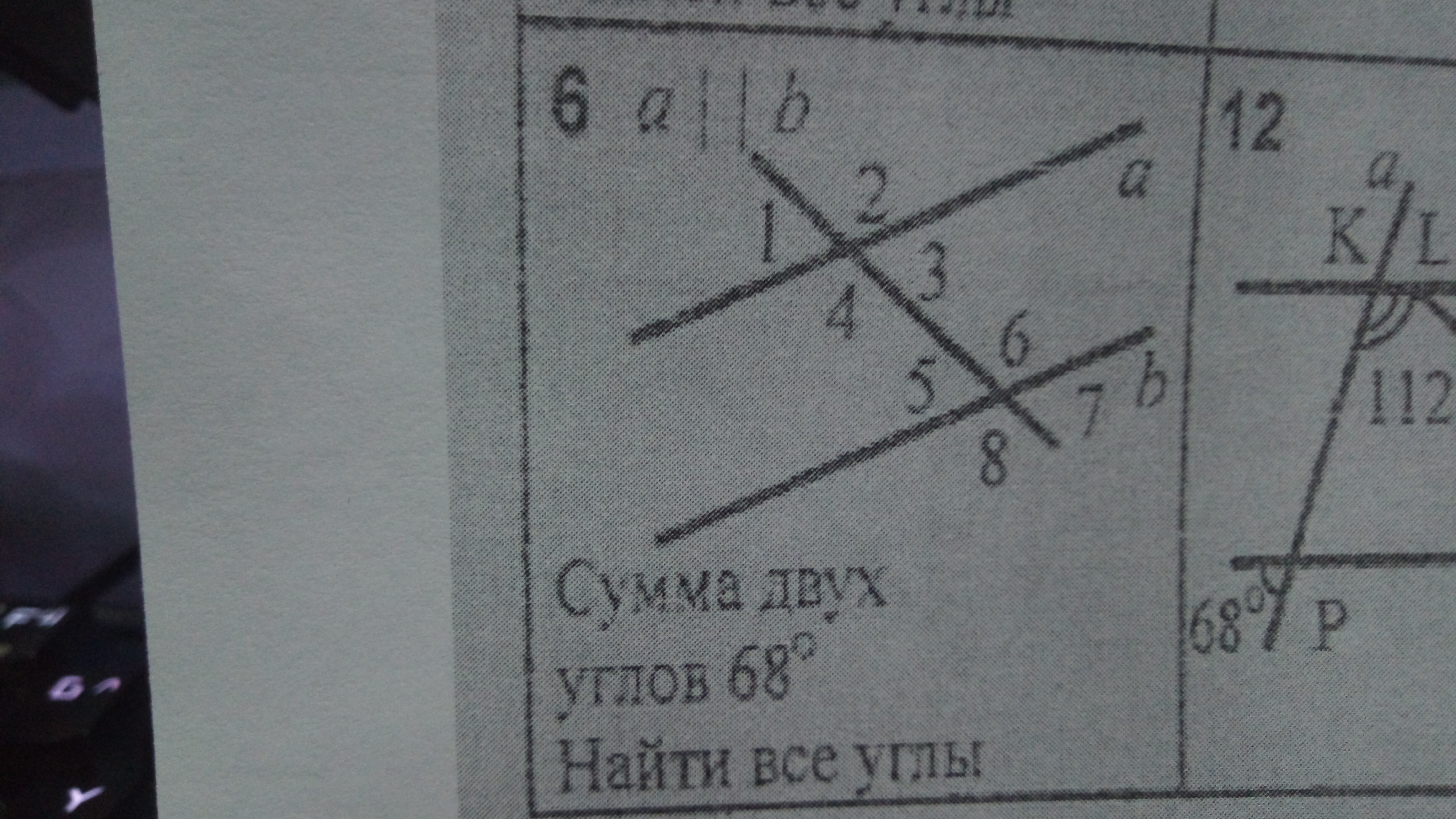 Линии параллельны. Значит, вертикальные равны и накрест лежащие. То есть <1=<3=<5=<7 и <2=<4=<6=<8. А сумма внутренних односторонних равна 180 градусам. Значит, 68 градусов- это сумма двух равных меньших углов. 68:2=34 градуса- это углы 1,3,5и 7. 180-34=146 градусов -это углы 2,4,6 и 8