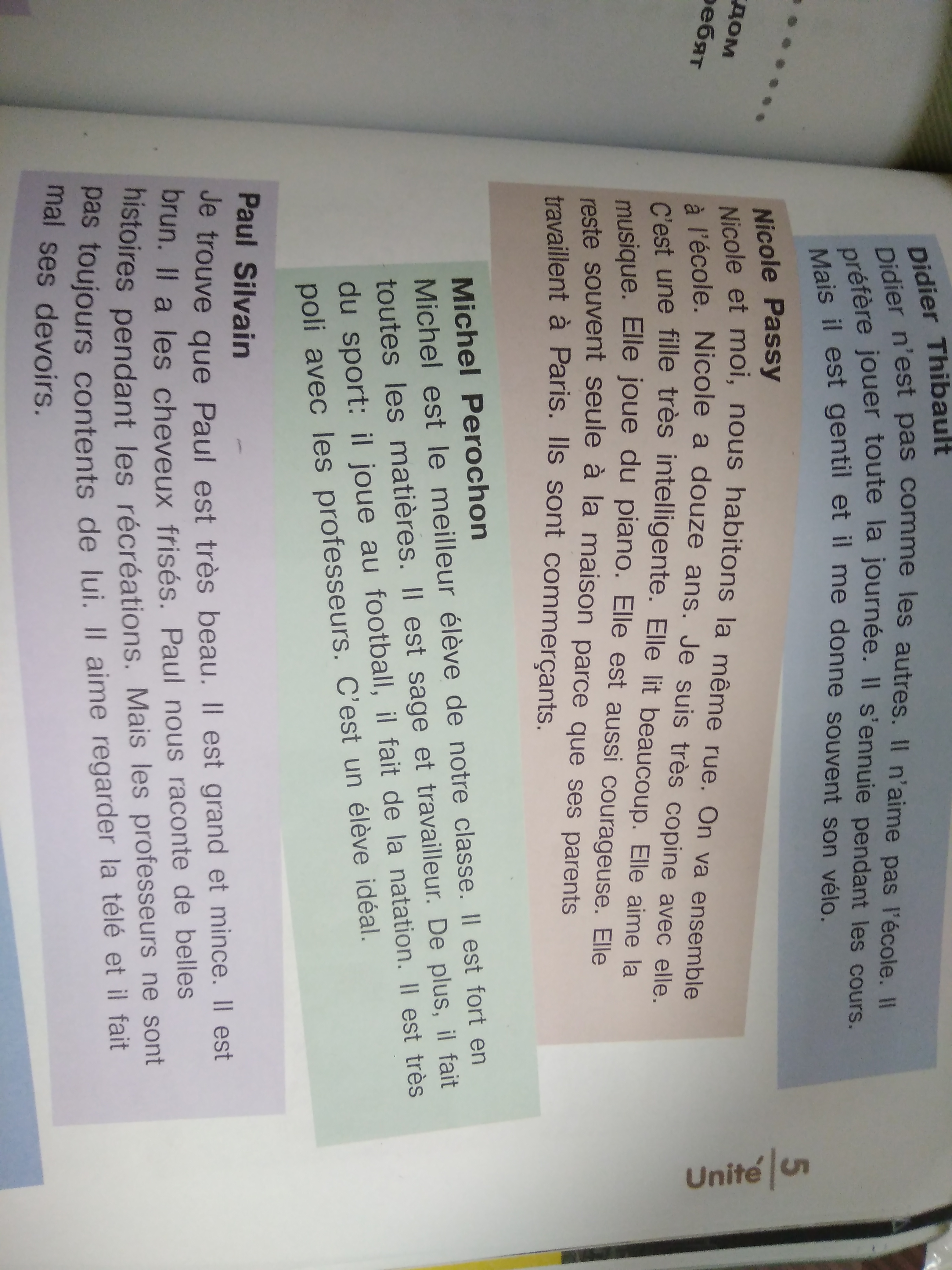 Дидье Тиба играет весь день. Ему становится скучно во время занятий. не так, как другие. Он не любит школу. Он хороший и он часто дает мне свой велосипед. Николь Пасси, мы живем на одной улице. Мы идем вместе. Николь двенадцать лет. Я очень подружка с ней. очень умная девушка. Она много читает. Она любит музыку. Она играет на пианино. Она тоже смелая. Она часто остается дома одна, потому что ее родители работают в Париже. Они трейдеры. Мишель Перочон Мишель - лучший ученик в нашем классе. Он силен во всех предметах. Он мудрый и трудолюбивый. Кроме того, он занимается спортом: он играет в футбол, он плавает. Он очень вежлив с учителями. Он идеальный ученик. Пол Сильвейн Я думаю, что Пол очень красивый. Он высокий и худой. Я голая. У него вьющиеся волосы. Павел рассказывает нам красивые киоски во время перемены. Но учителя не всегда довольны им. Он любит смотреть телевизор и вредит своей домашней работе.