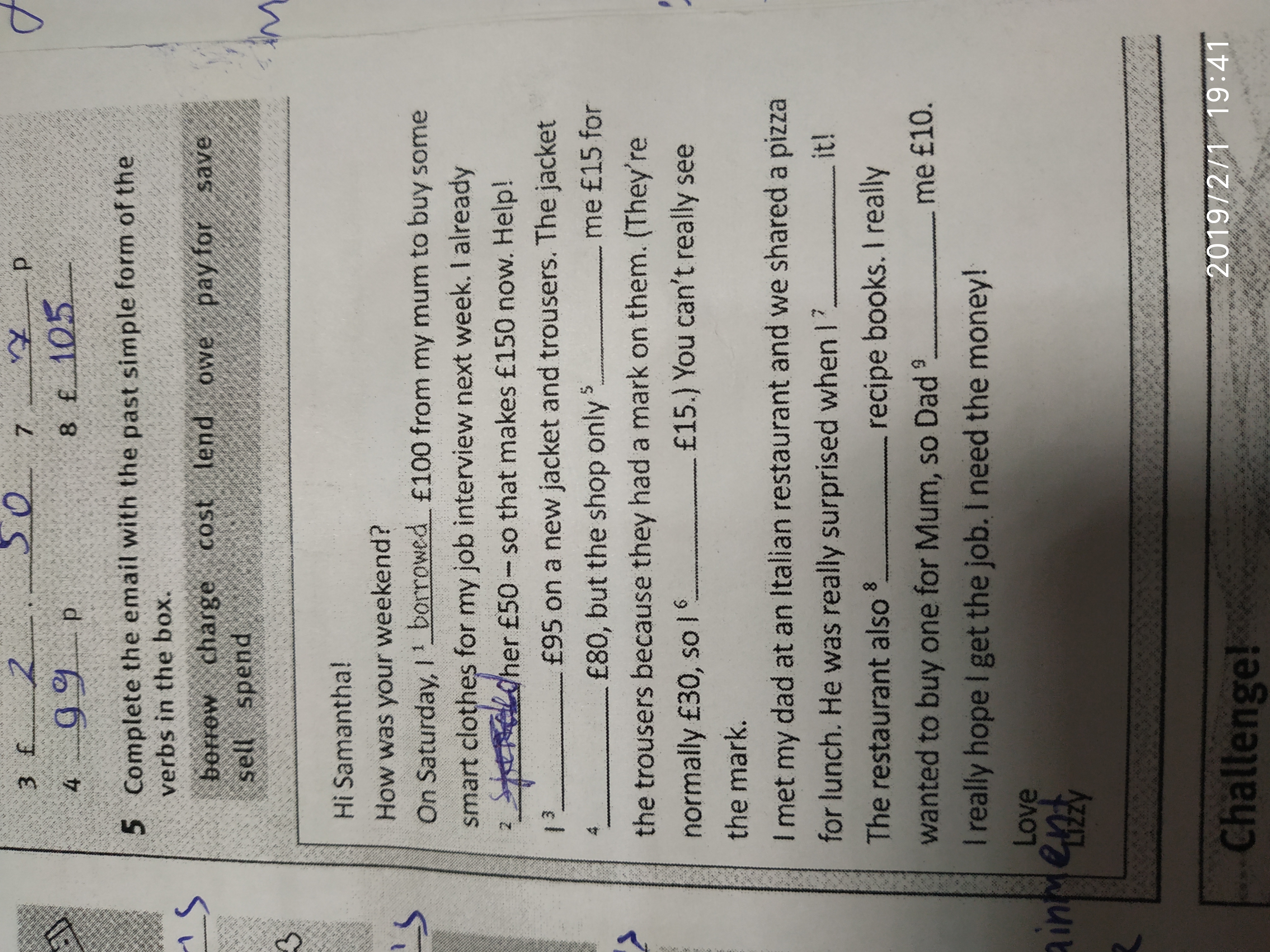 2 owed, 3 spent, 4 cost, 5 charged , 6 saved, 7 paid for, 8 sold 9 lent