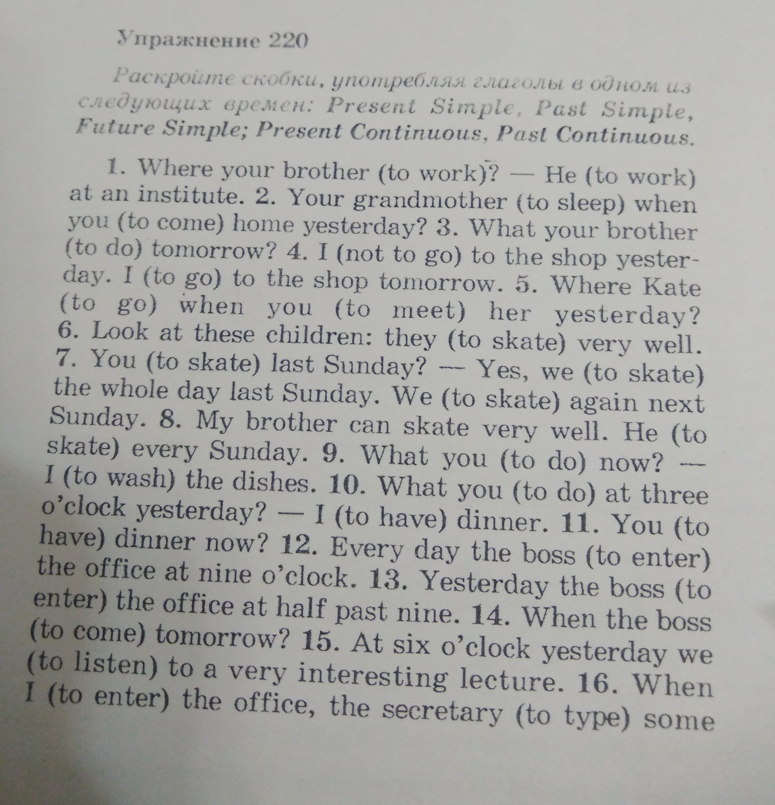 1. Where does your brother work? He works at an institute. 2. Was your grandmother sleeping when you came home yesterday? 3. What will your brother do tomorrow? 4. I did not go yester¬day. I shall go to the shop tomorrow. 5. Where was Kate going when you met her yesterday? 6. Look at these children: They are skating very well. 7. Did you skate last Sunday? Yes, we were skating the whole day last Sunday. We shall skate again next Sunday. 8. My brother can skate very well. He skates every Sunday. 9. What are you doing now? I am washing the dishes. 10. What were you doing at three o’clock yesterday? I was having dinner. 11. Are you having dinner now? 12. Every day the boss enters he office at nine o’clock. 13. Yesterday the boss entered the office at half past nine. 14. When will the boss come tomorrow? 15. At six o’clock yesterday we were listening to a very interesting lecture. 16. When I entered the office, the secretary was typing.