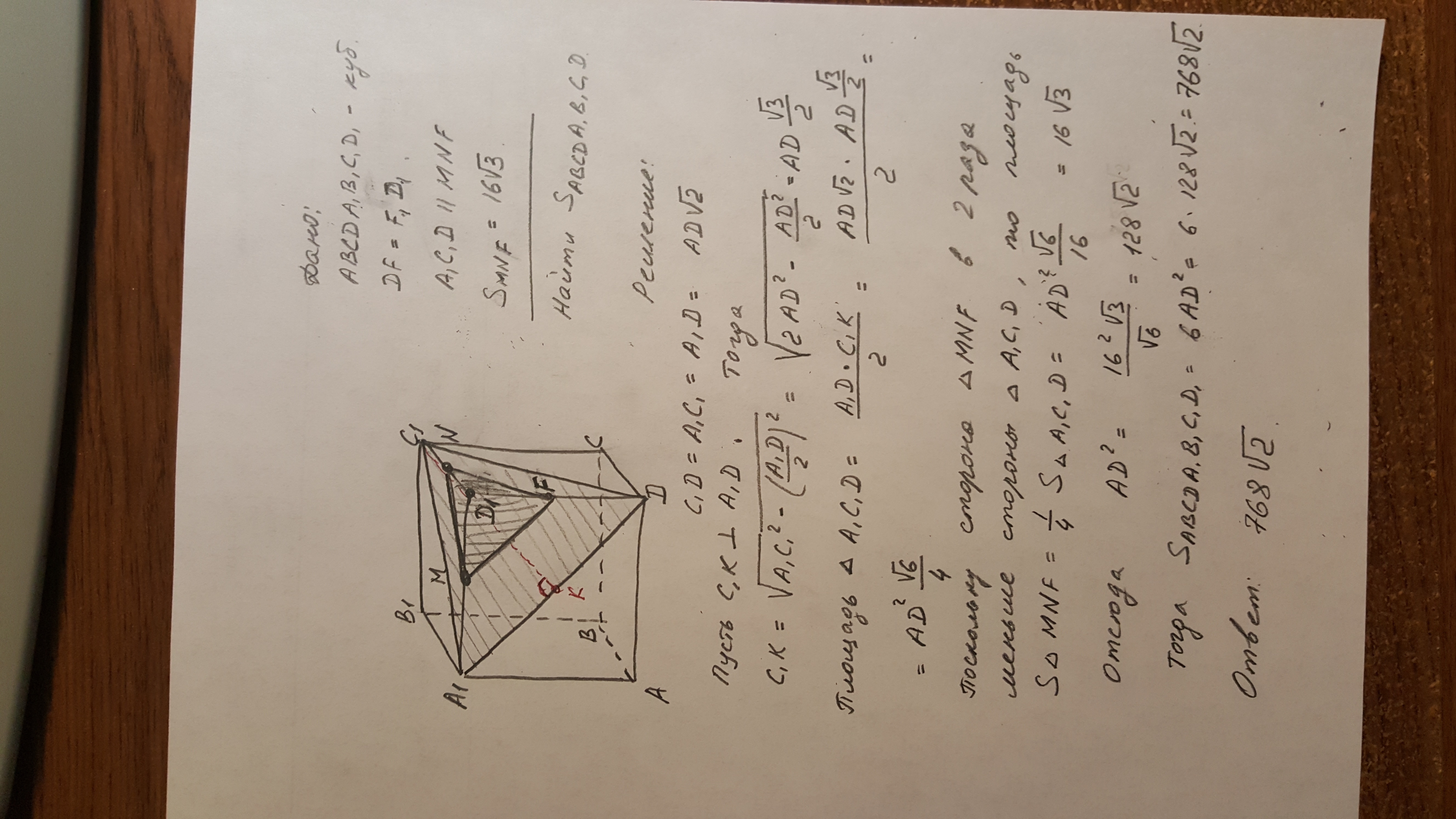 Точка F - середина ребра DD1 куба ABCDA1B1C1D1. Постройте сечение куба плоскостью,проходящей через точку F и параллельной плоскости A1C1D. Вычислите площадь поверхности куба, если площадь полученного сечения равна 16✓3