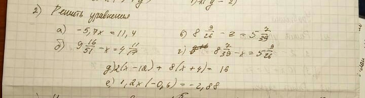 1) X = -11,4 : 5,7 = - 2; 2) x = 9 16/51 - 4 11/17 = 8 67/51 - 4 33/51 = 4 34/51 = 4 2/3; 3) z = 8 9/26 - 5 7/39 = 3 13/39 = 3 1/3; 4) x = 8 7/39 - 5 9/26 = 3 1/26; 5) 2x - 24 + 8x + 32 = 16; 10x = 8; x = 0,8; 6) 1,2x · ( - 0,6) = - 2,88; x = 2,88 : 0,72 = 4