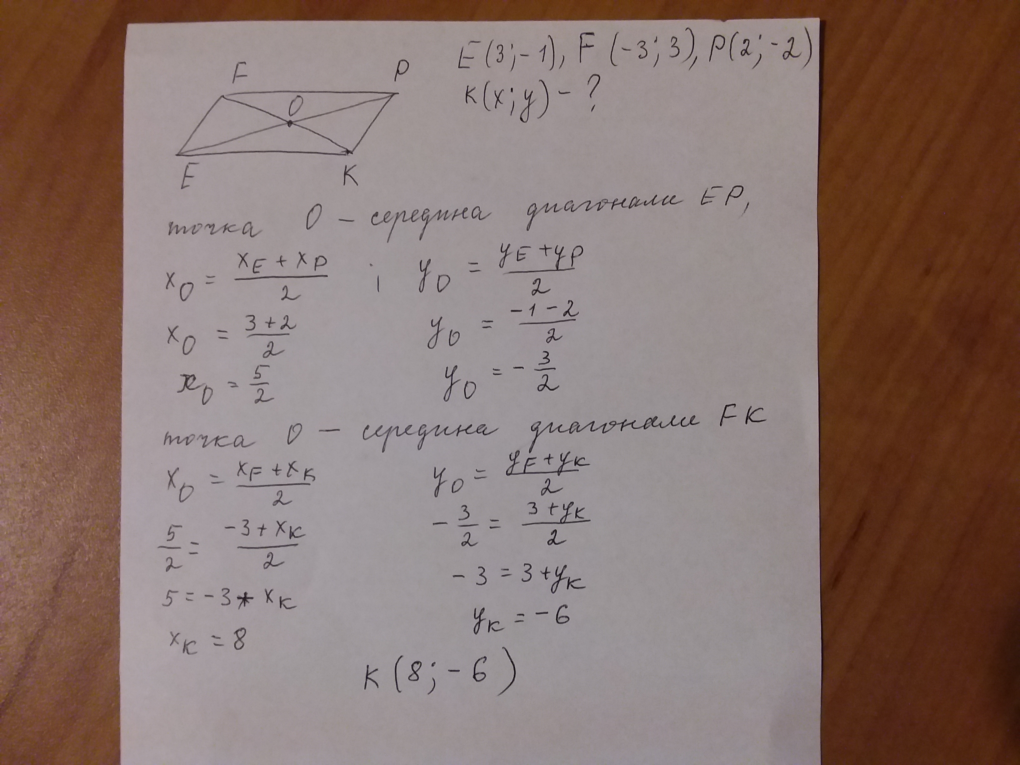 найдите координаты вершины K параллелограмма, EFPK, если E (3; -1). F (-3;3), P (2;-2). ПОМОГИТЕ