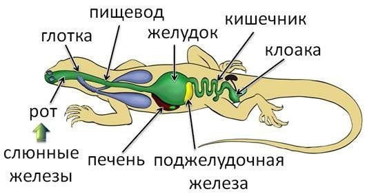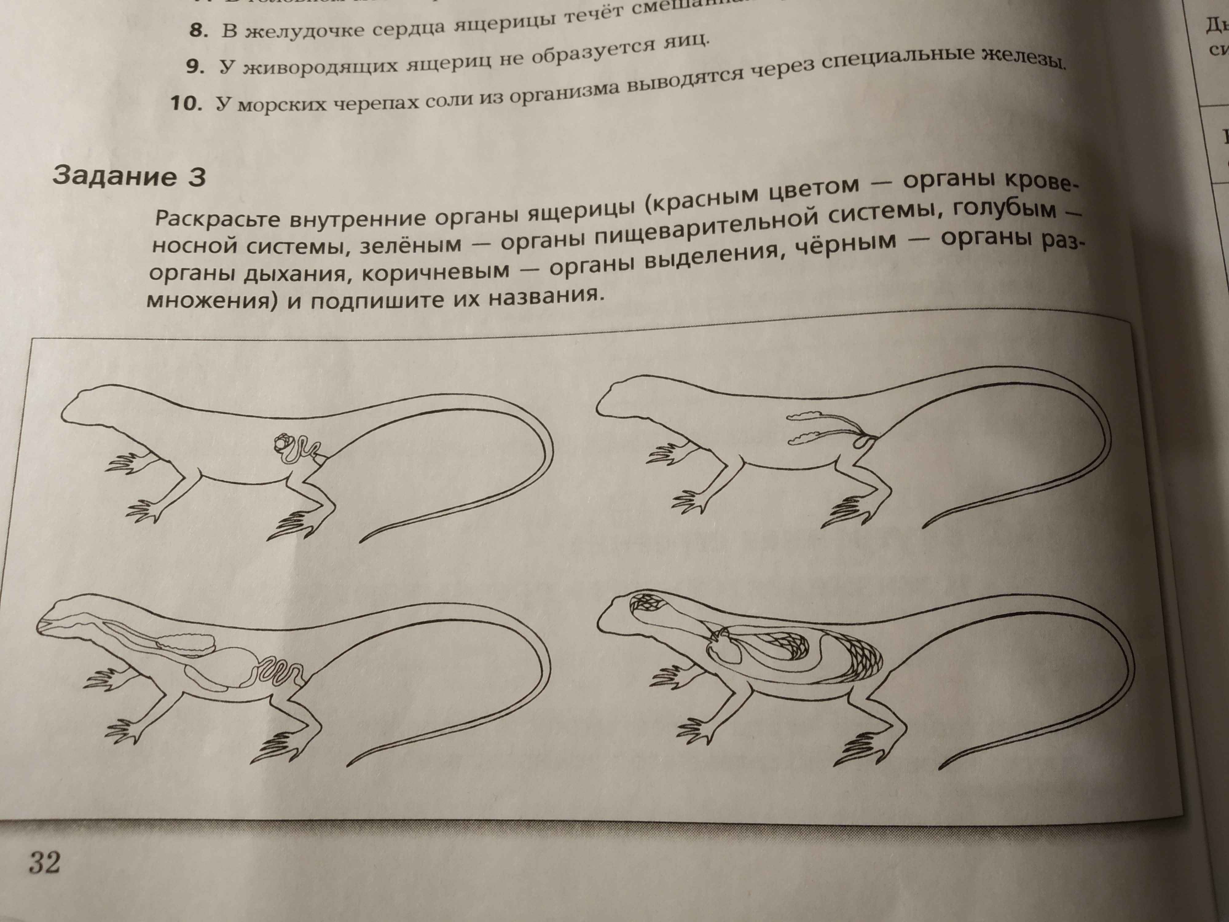 раскрасьте внутренние органы ящерицы (красным цветом - органы кровеносной системы, зеленым органы пищеварительной системы, голубым органы дыхания, коричневым органы выделения, чёрным органы размножения) и подпишите их названия