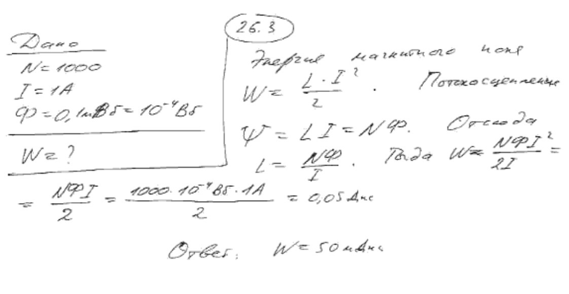 Соленоид содержит N = 1000 витков. Сила тока I в обмотке равна 1 А, магнитный поток Ф через поперечное сечение соленоида равен 0,1 мВб. Вычислить энергию магнитного поля внутри соленоида.