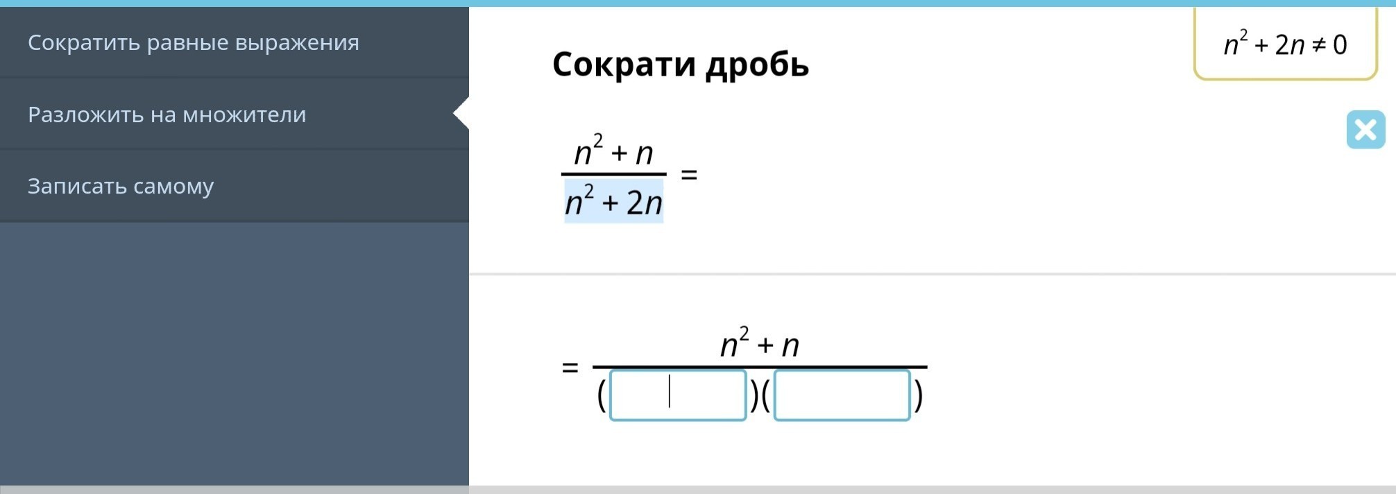 frac{n^{2}+n }{n^{2}+2n } =frac{n(n+1)}{n(n+2)} =frac{n+1}{n+2}