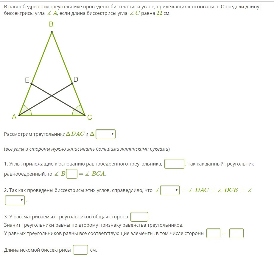 В равнобедренном треугольнике проведены биссектрисы углов, прилежащих к основанию. Определи длину биссектрисы угла ∡A, если длина биссектрисы угла ∡C равна 22 см СРОЧНО!!!!!!!!!!!!!!!!!!!!!!