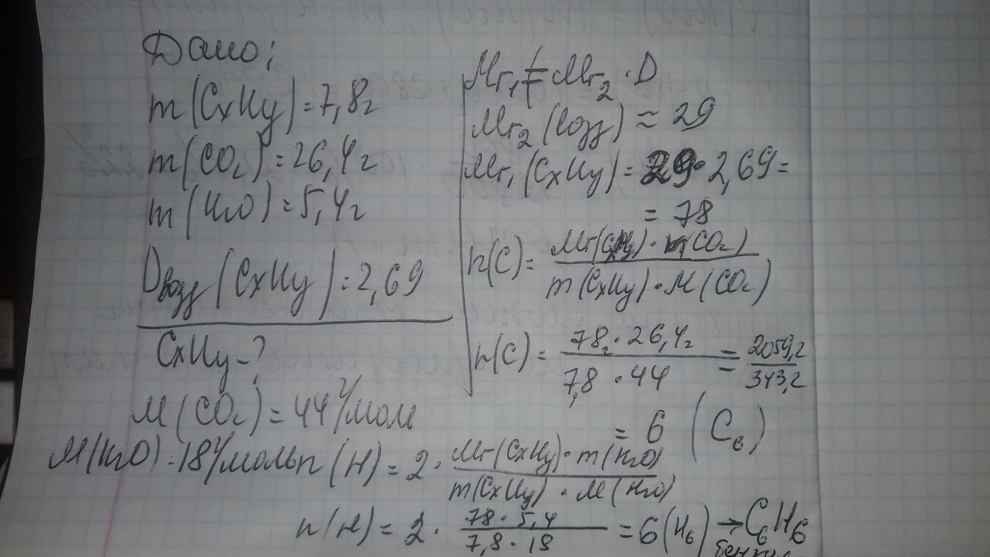 При сжигании углеводорода массой 7,8 г получили 26,4г углекислого газа и 5,4 г. Воды. Относительная плотность по воздуху равна 2,69.определите молекулярную формулу веществ