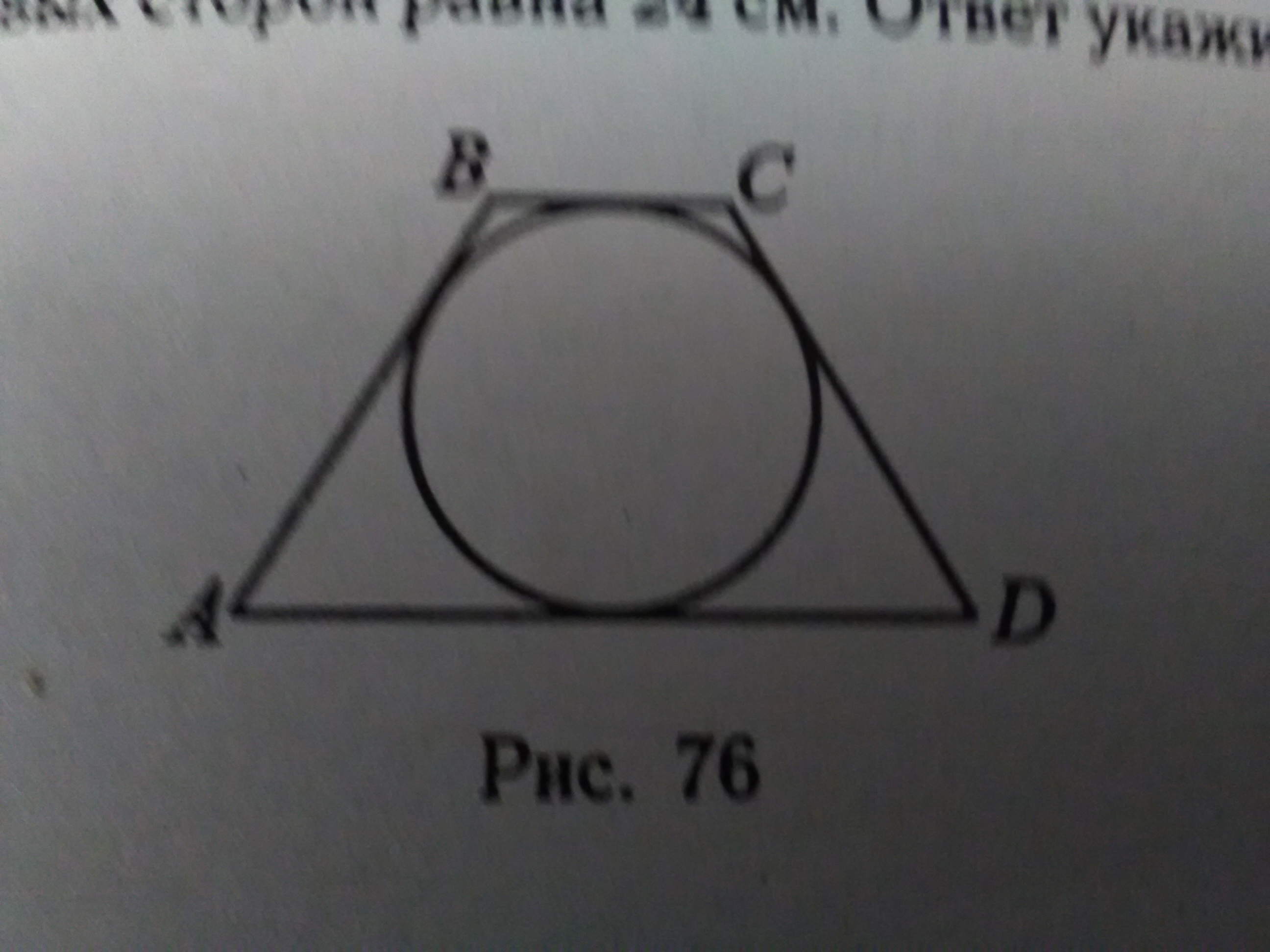 В равнобедренную трапецию ABCD с основаниями AD и BC вписана окружность (см. рис. 76). Найдите среднюю линию этой трапеции, если ее сумма боковых сторон равна 24 см. Ответ укажите в сантиметрах.