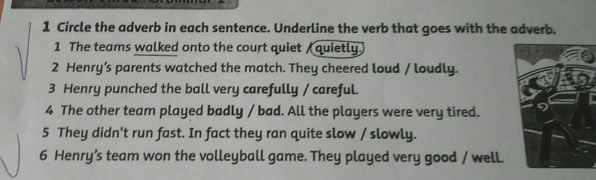 2 loudly 3 carefully 4 bad 5 slow 6 welll