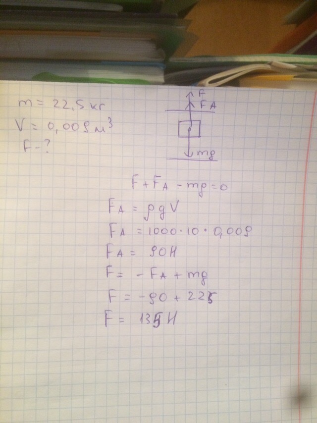 Масса камня 22,5 кг, объем камня 0,009м^3(метра кубических). Какая сила потребуется, чтобы удержать погруженный в воду камень? СРОЧНО!