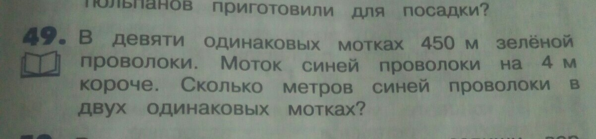 в 9 мотках по 50 метров зеленой проволки, а в 2 мотках по 46 метров синей проволки. Сколько метров в 9 мотках зеленой проволки? Сколько метров в 2 мотках синей проволки?