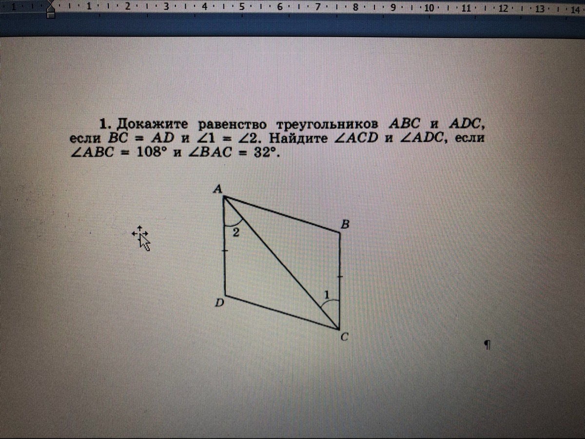 AD=BC; ∠1=∠2; AС- общая⇒ΔADC=ΔCBA по двум сторонам и углу между ними. ∠ACD=∠BAC; ∠ADC=∠CBA