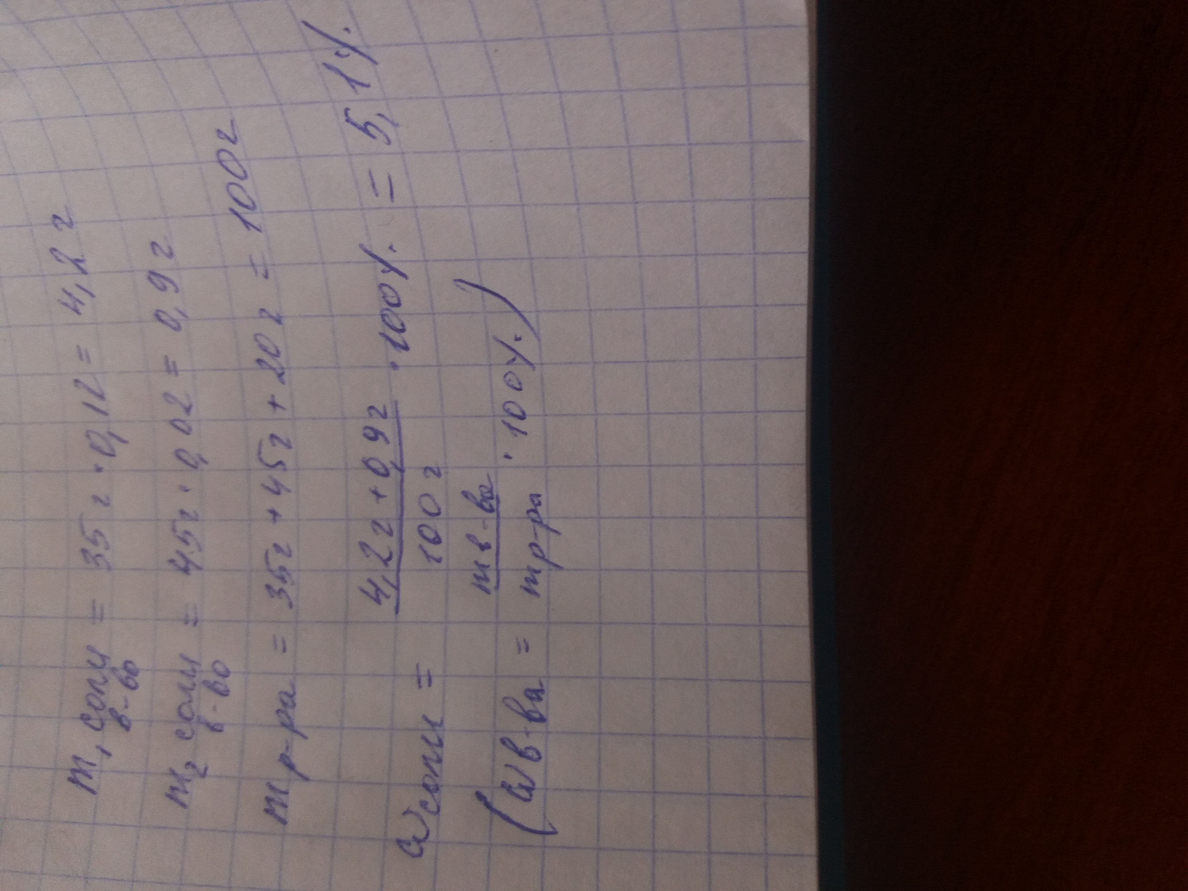 К 12% раствору соли массой 35 г добавили 45 г 2%-ного раствора той же соли, полученный раствор разбавили 20 г воды. Найдите массовую долю соли (в %) в итоговом растворе