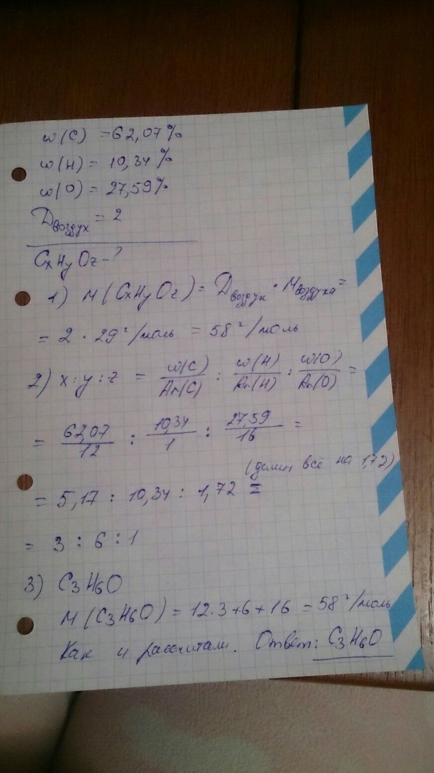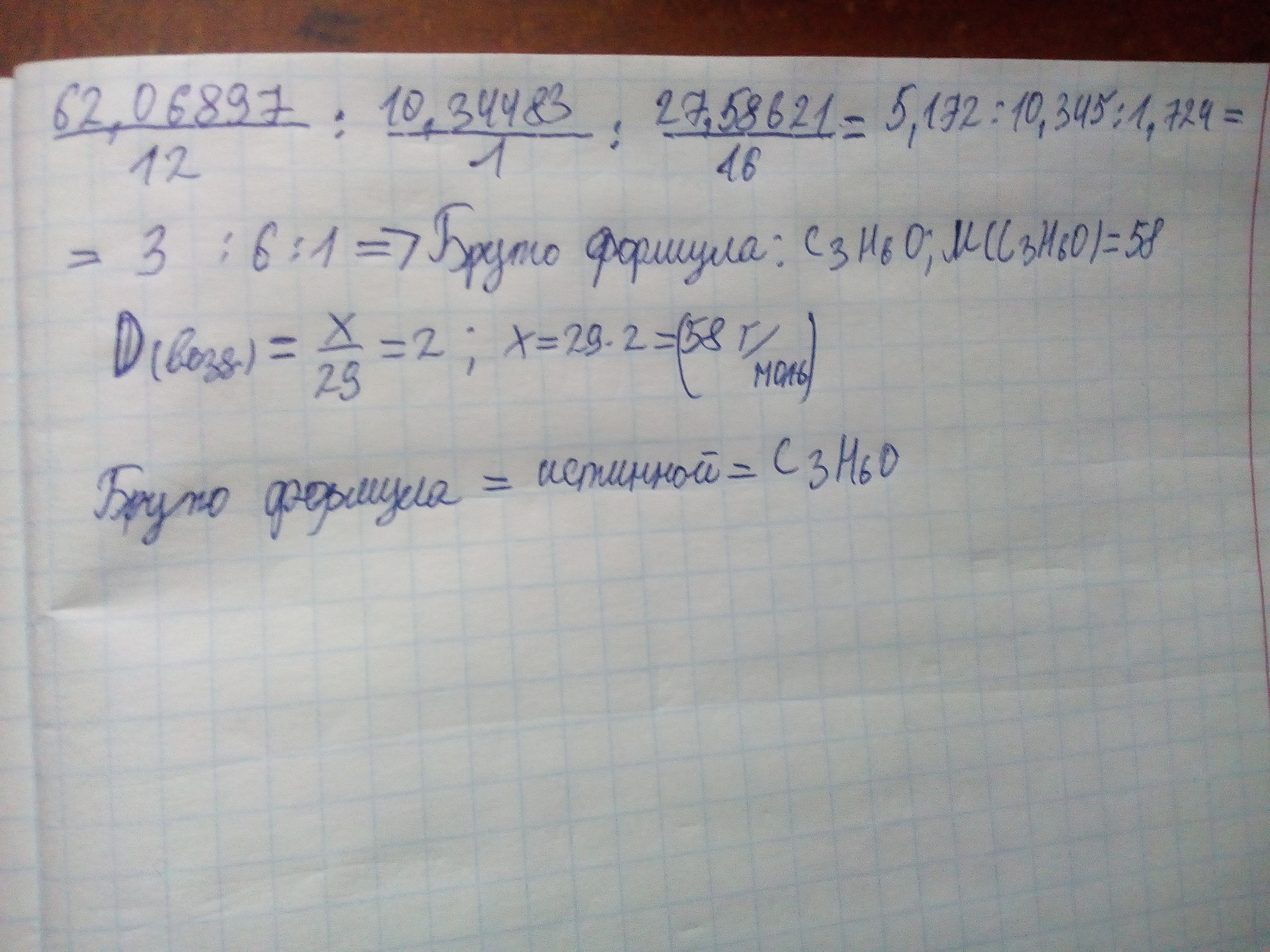 Углерода 62,06897℅, водорода 10,34483℅, оксигена 27,58621℅. Плотность по воздуху = 2. Найти истинную формулу вещества