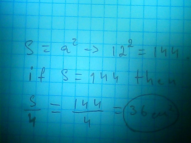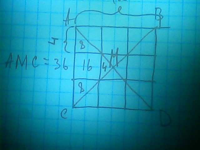 Квадрат ABCD сторона которого 12 см разделен на 9 равных квадратов.Найдите площадь теугольника AMC