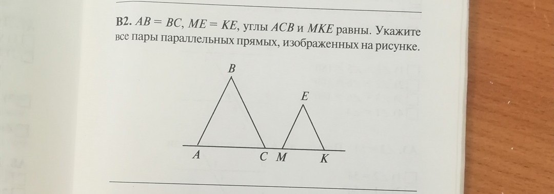 3) По условию ∠ACB=∠MKE Значит ∠BAC=∠ACB=∠EMK=MKE. У треугольников нижние углы одинаковые
