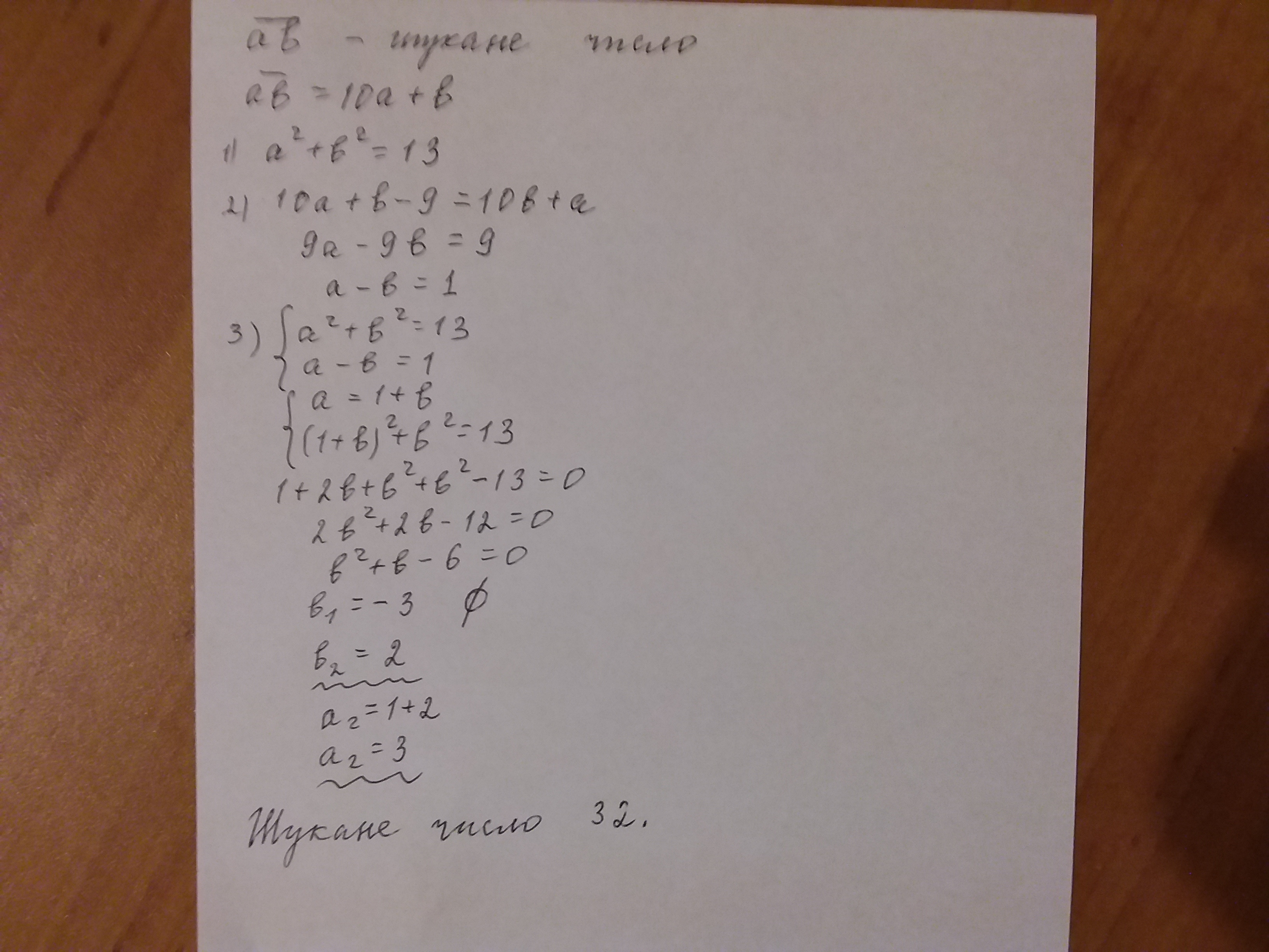 Сума квадратів цифр додатного двоцифрового числа дорівнює 13. Якщо від цього числа відняти 9, то отримаємо число записане тими самими цифрами але в зворотньому порядку