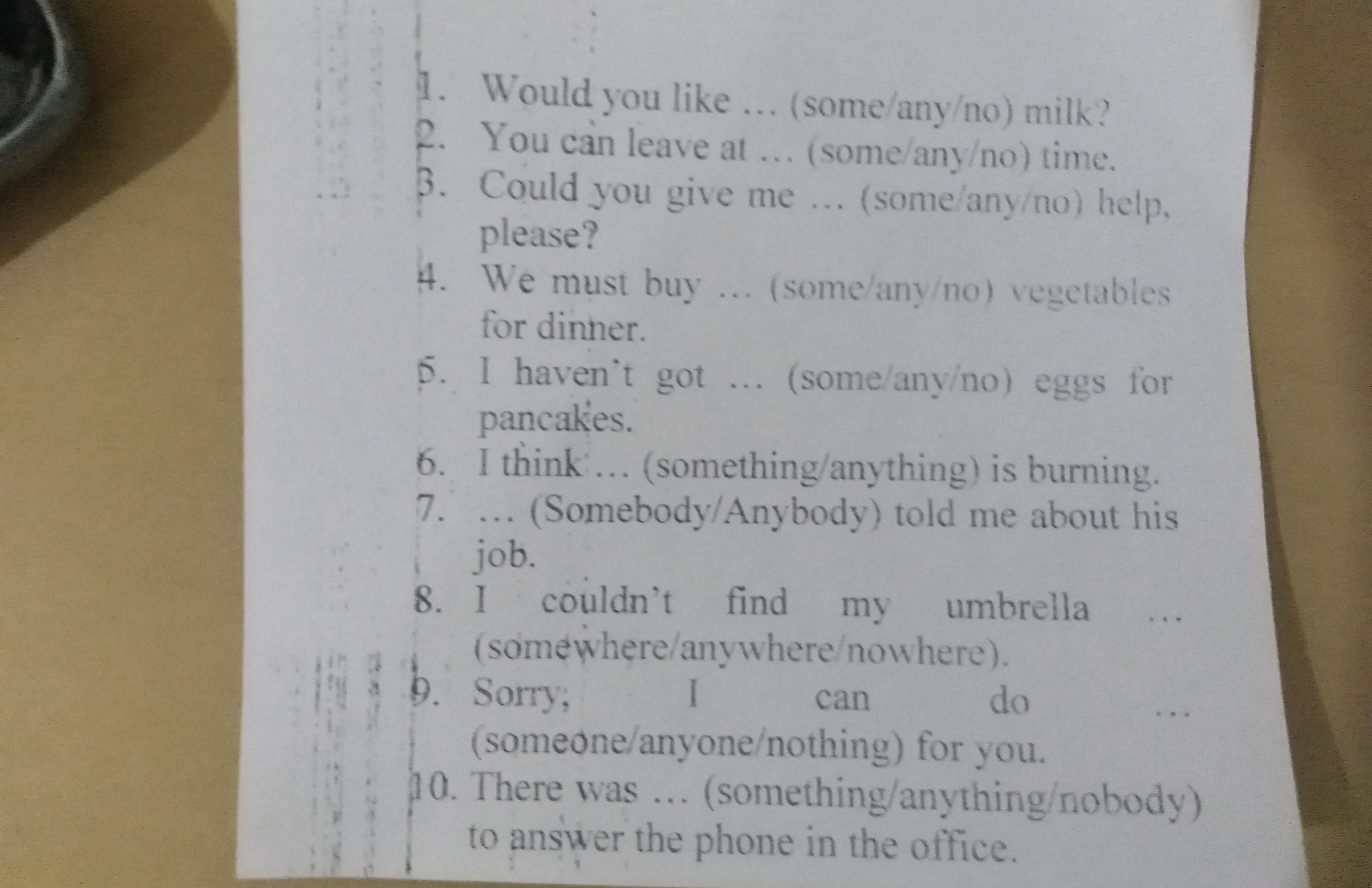1some 2 any 3 some 4 some 5 any 6 something 7 somebody 8 anywhere 9 nothing 10 nobody