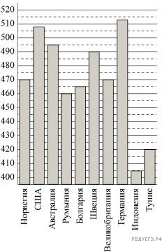На диаграмме показан средний балл участников 10 стран в тестировании учащихся 8-го класса по математике в 2007 году (по 1000-балльной шкале). Используя диаграмму ответьте на вопрос.