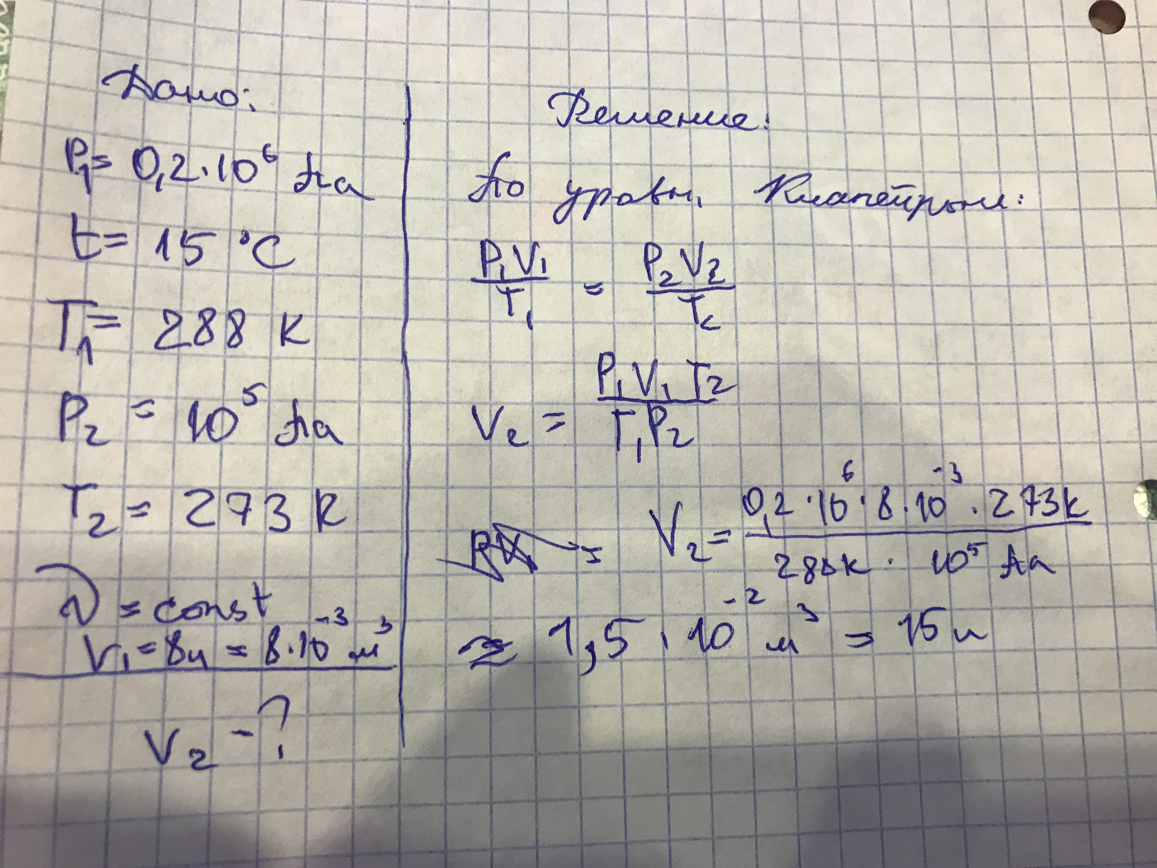 газ при давлении 0.2 МПа и температуре 15 С имеет объем 8 л. Чему равен объем газа этой массы при нормальных условиях?