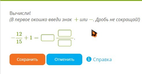 -12/15 + 1 = -12/15 + 15/15 = - 3/15 = - 1/5