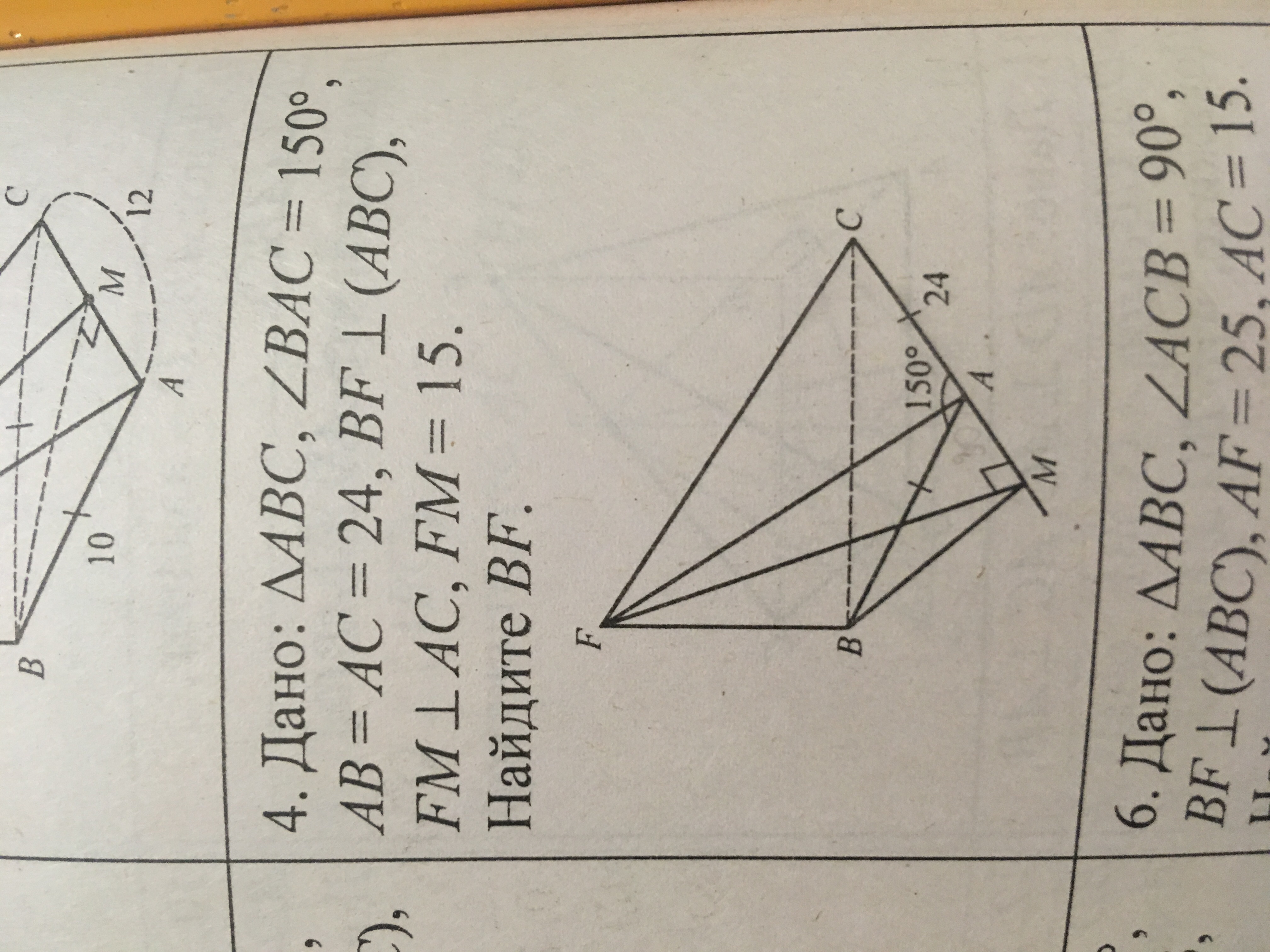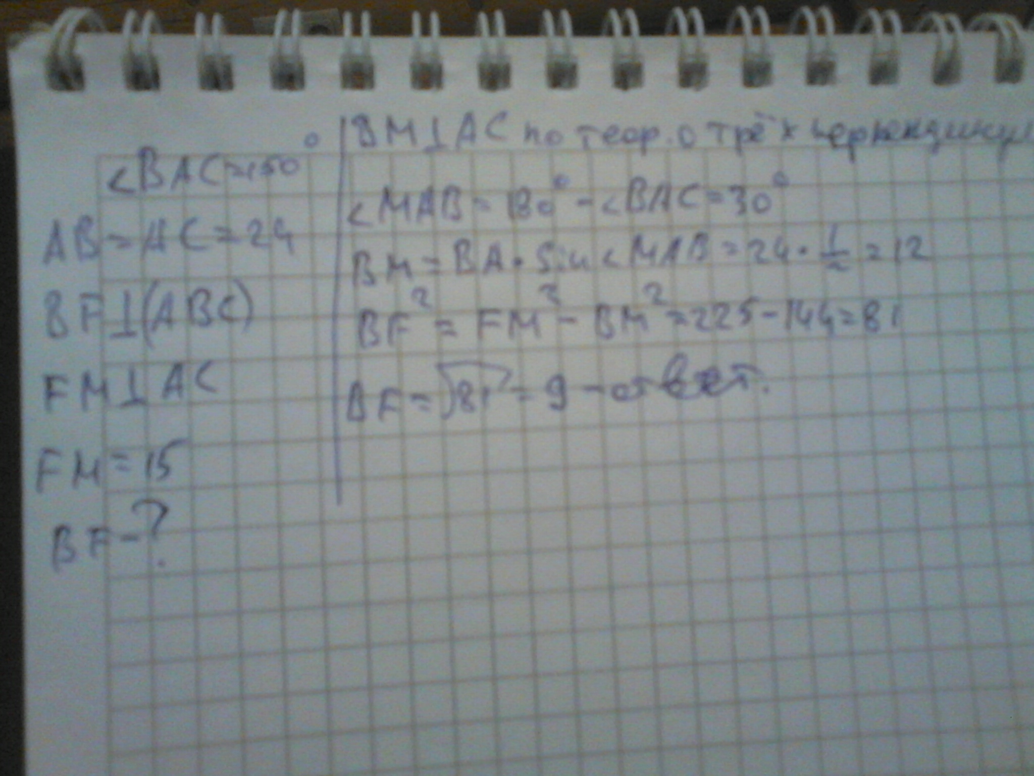 Дано: треугольник ABC, угол BAC=150, AB=AC=24, BF перпендикулярно плоскости ABC, FM перпендикулярно AC, FM=15. Найти BF.