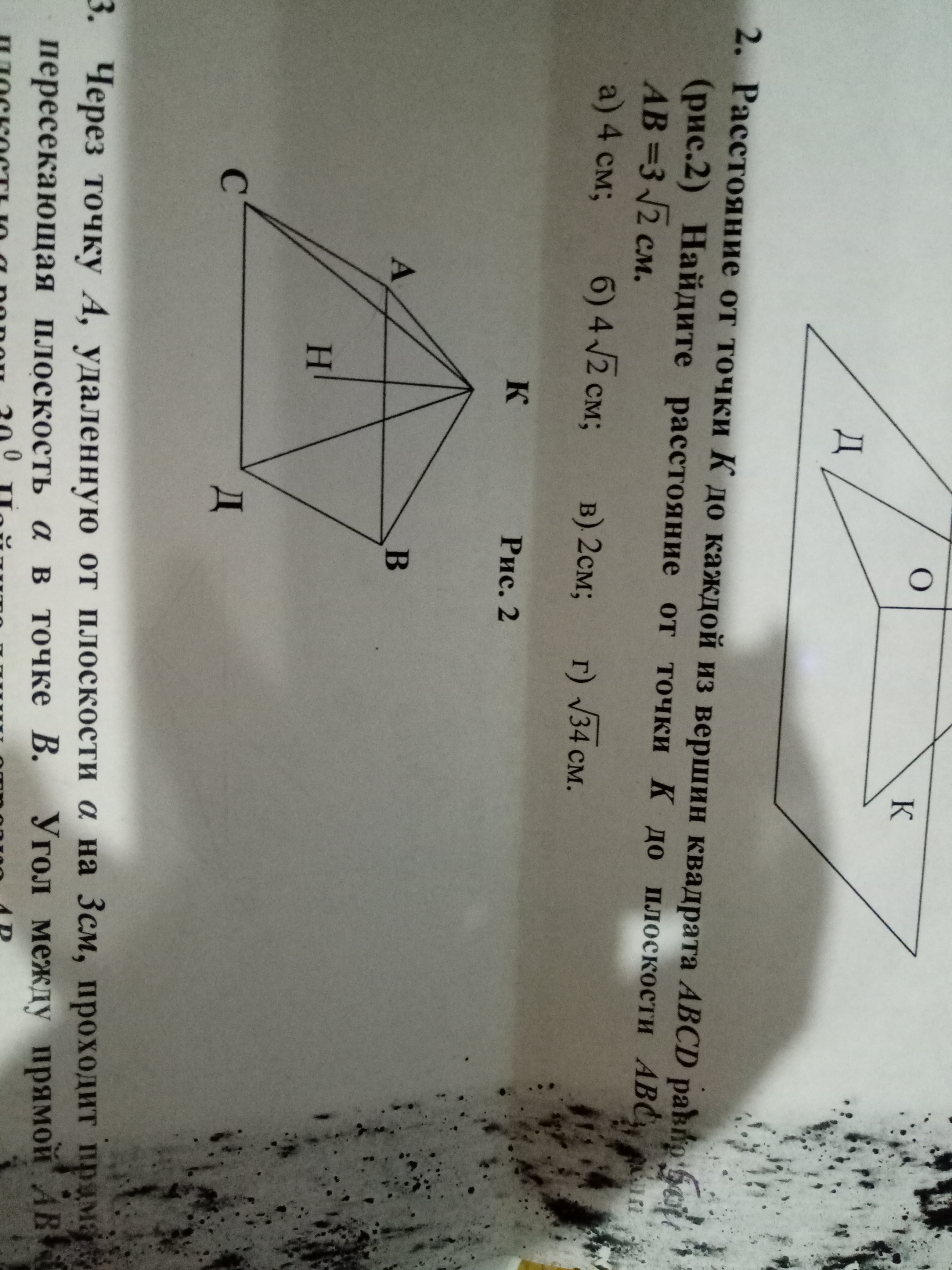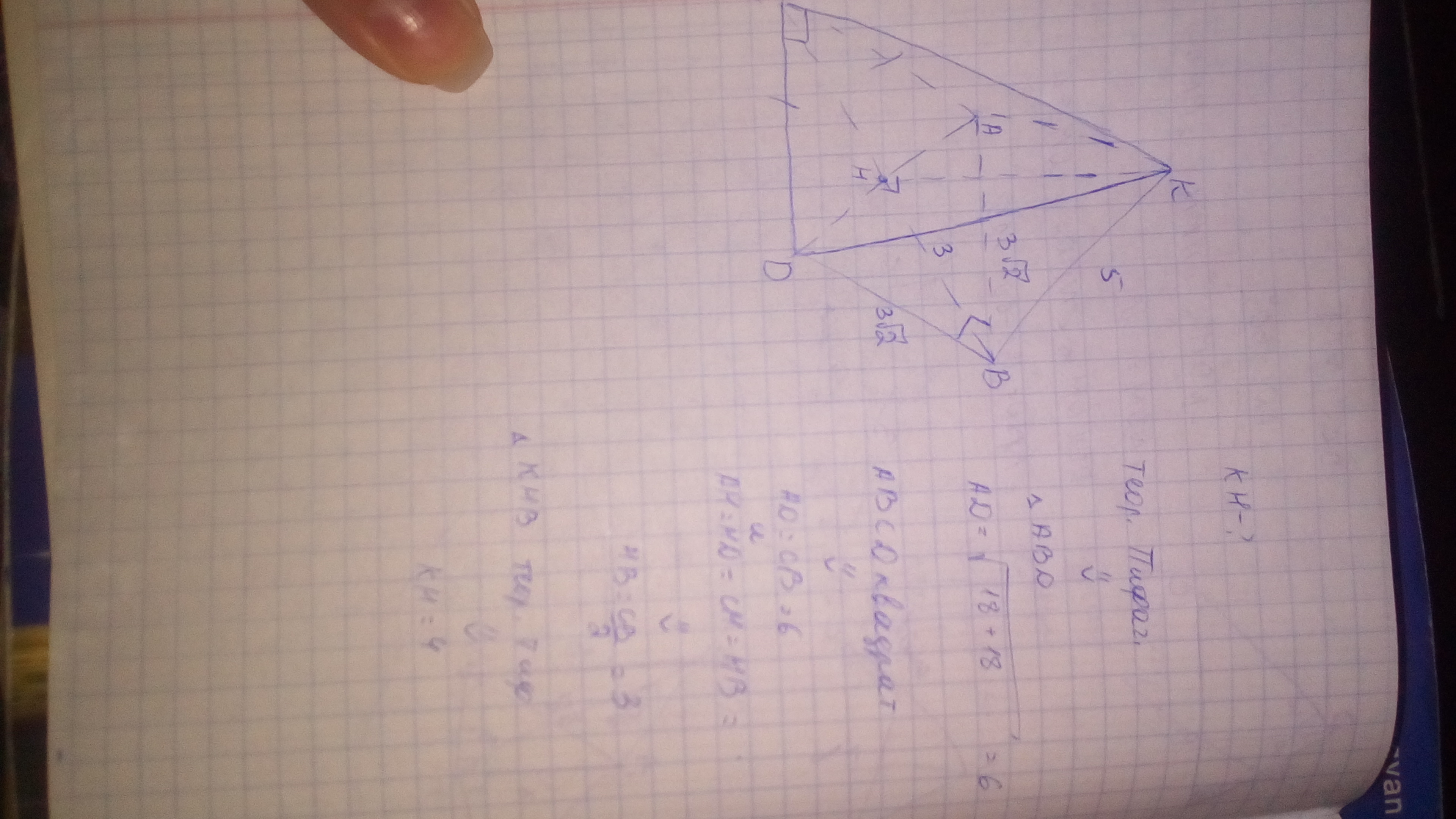 Расстояние от точки К до каждой из вершин квадрата ABCD равно 5 см. Найдите расстояние от точки К до плоскости ABC, если АВ=3√2 см