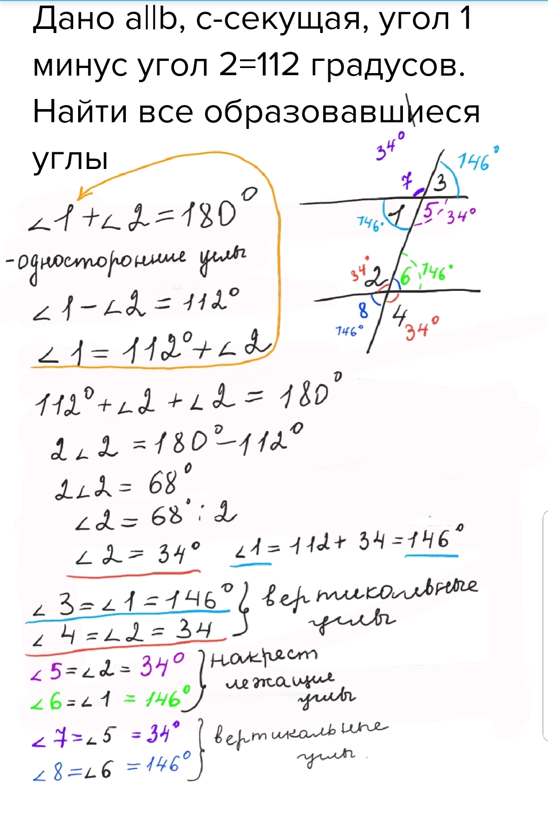 Помогите срочно решить. Дано a||b, c-секущая, угол 1 минус угол 2=112 градусов. Найти все образовавшиеся углы