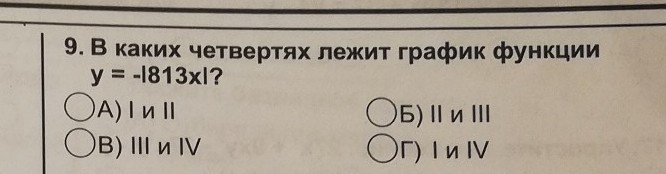 y=-I831XI названия функция не имеет,график прямая проходящая через начало координат , модуль означает что будет "птичка" перед модулем минус - значит птичка перевернутая а это значит что график находится в 3 и 4 четверти ОТВЕТ:В