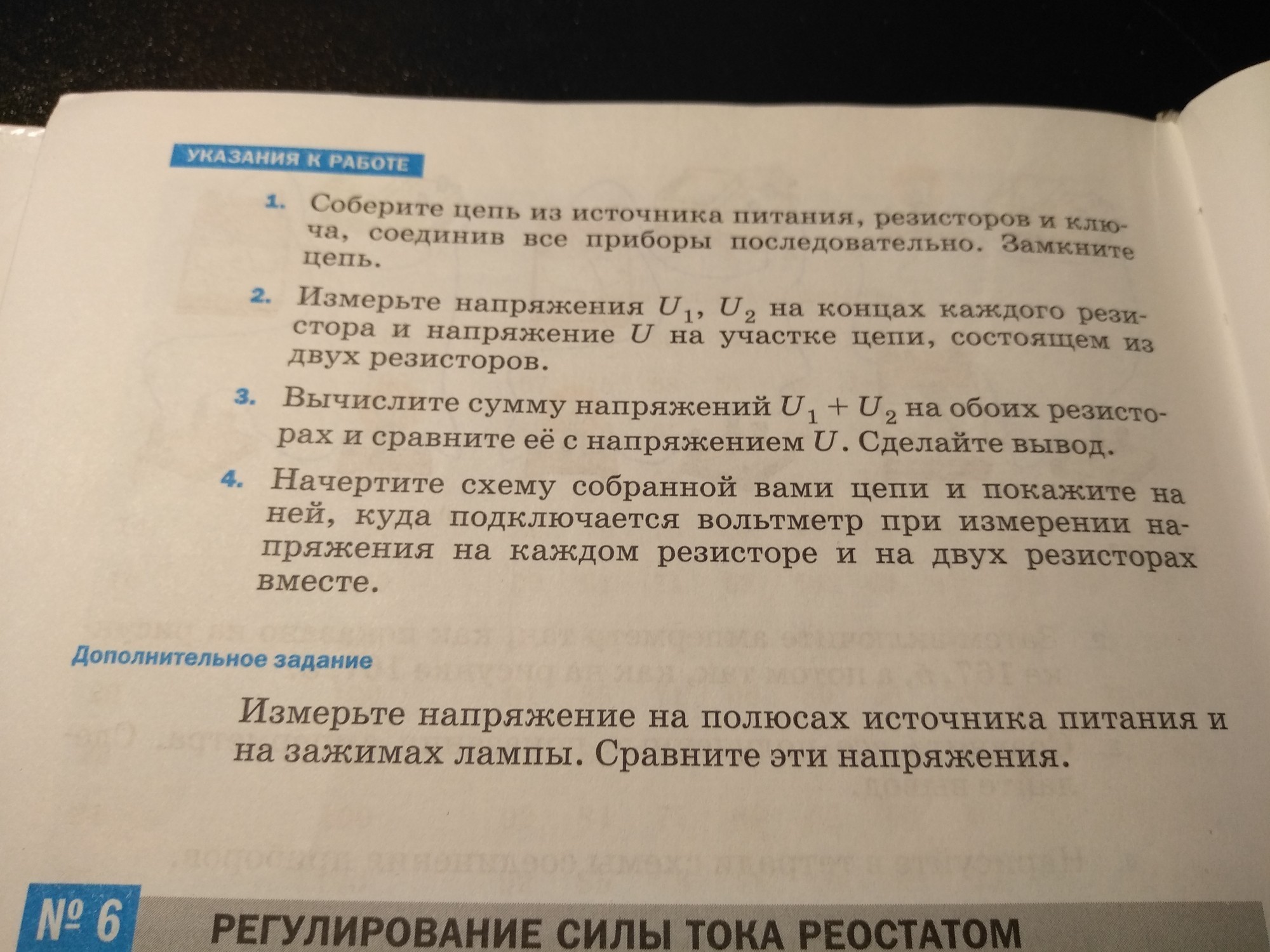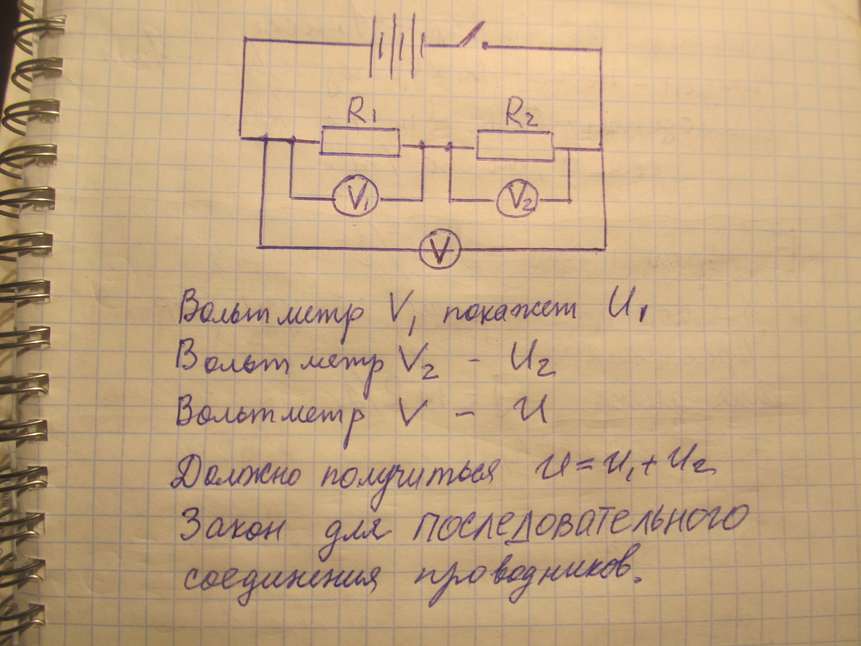 4.начертите схему собранной вами цепи и покажите на ней, куда подключается вольтметр при измерении напряжения на каждом резисторе и на двух резисторах вместе.