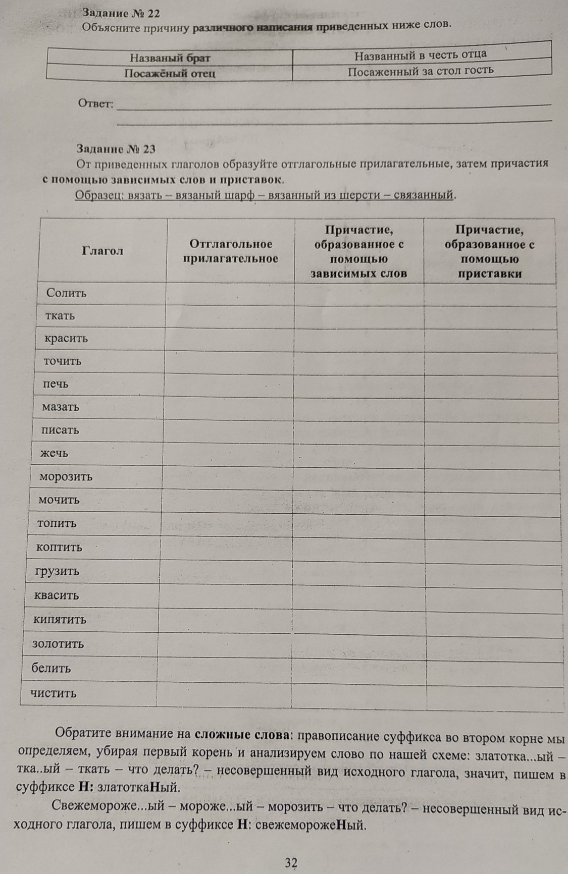 номер 22: в первом случае это отглагольное прилагательное, во втором - причастие, образованное при помощи зависимых слов.