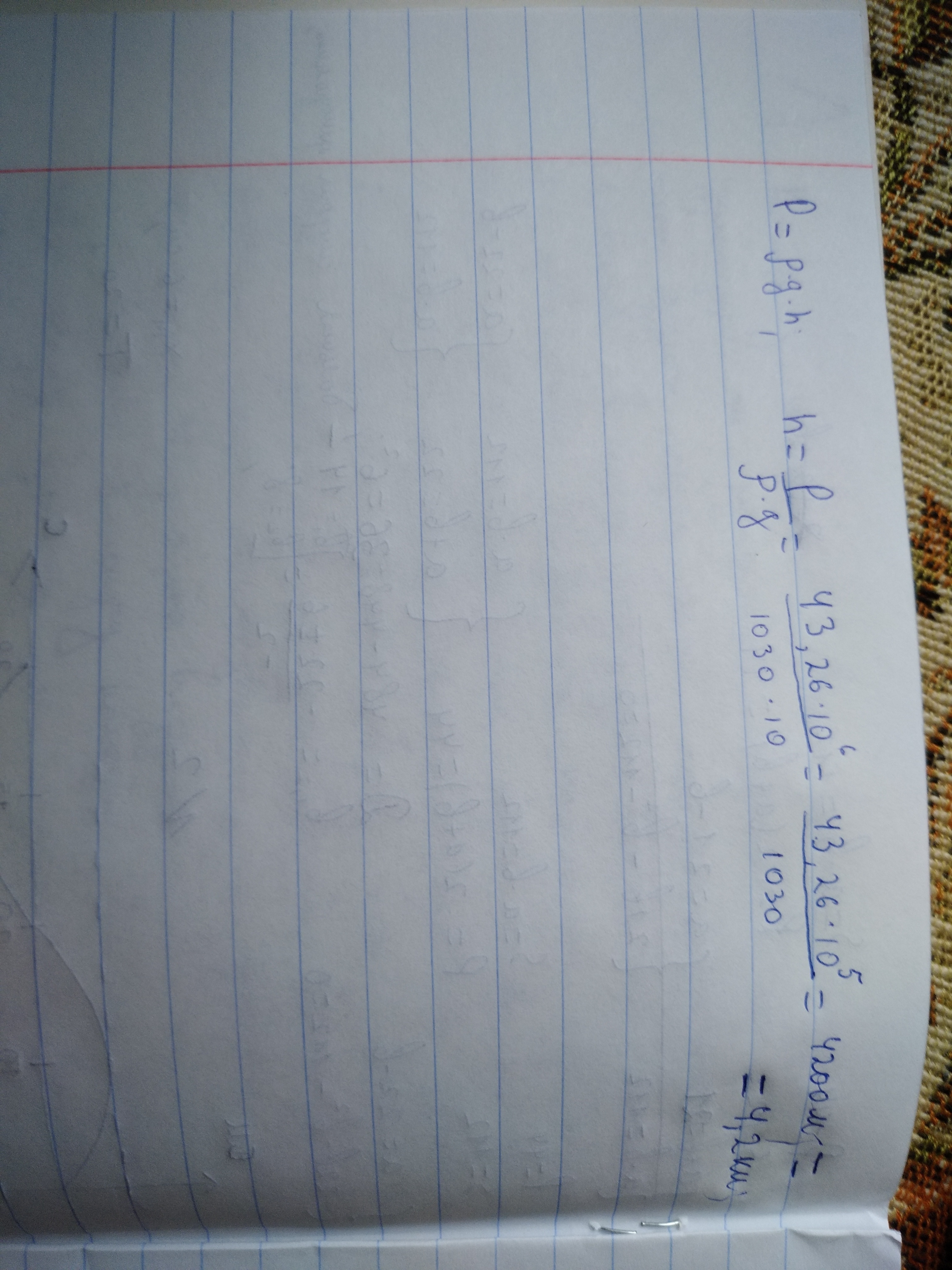 На какую глубину может погрузиться батискаф в морской воде, если стекло иллюминатора батискафа выдерживает давление 43,26 МПа? Плотность морской воды ρ=1030кг/м3,g≈10м/с2. Ответ округли до десятых. ( в КМ)