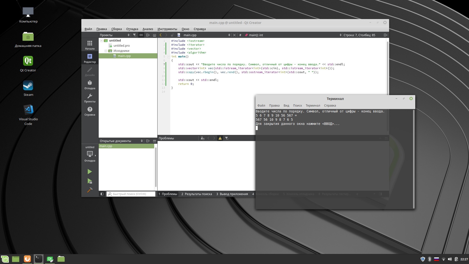 std::cout << "Вводите числа по порядку. Символ, отличный от цифры - конец ввода." << std::endl;