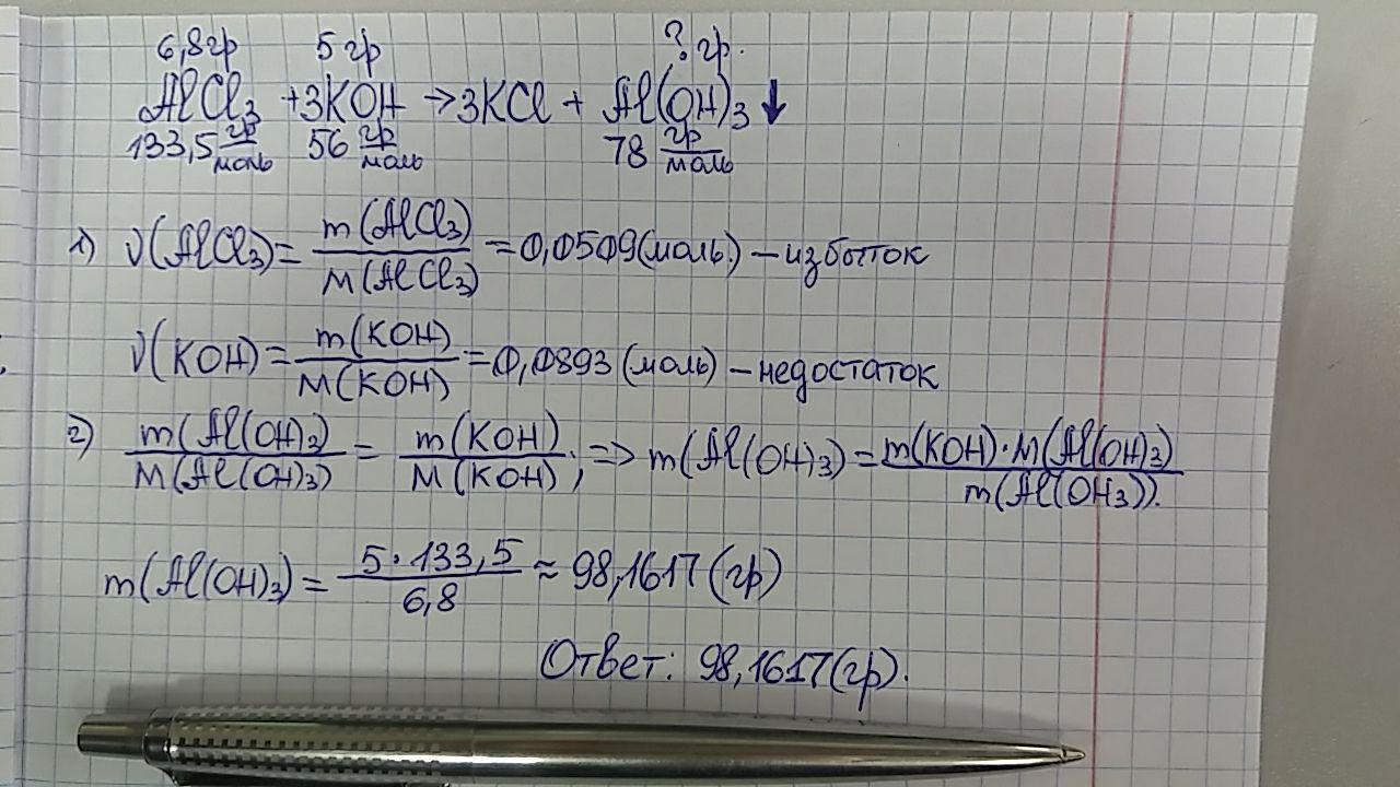 К раствору, содержащему 6.8 г AlCl3, прилили раствор, содержащий 5.0 г КОН. Найти массу образовавшегося остатка.