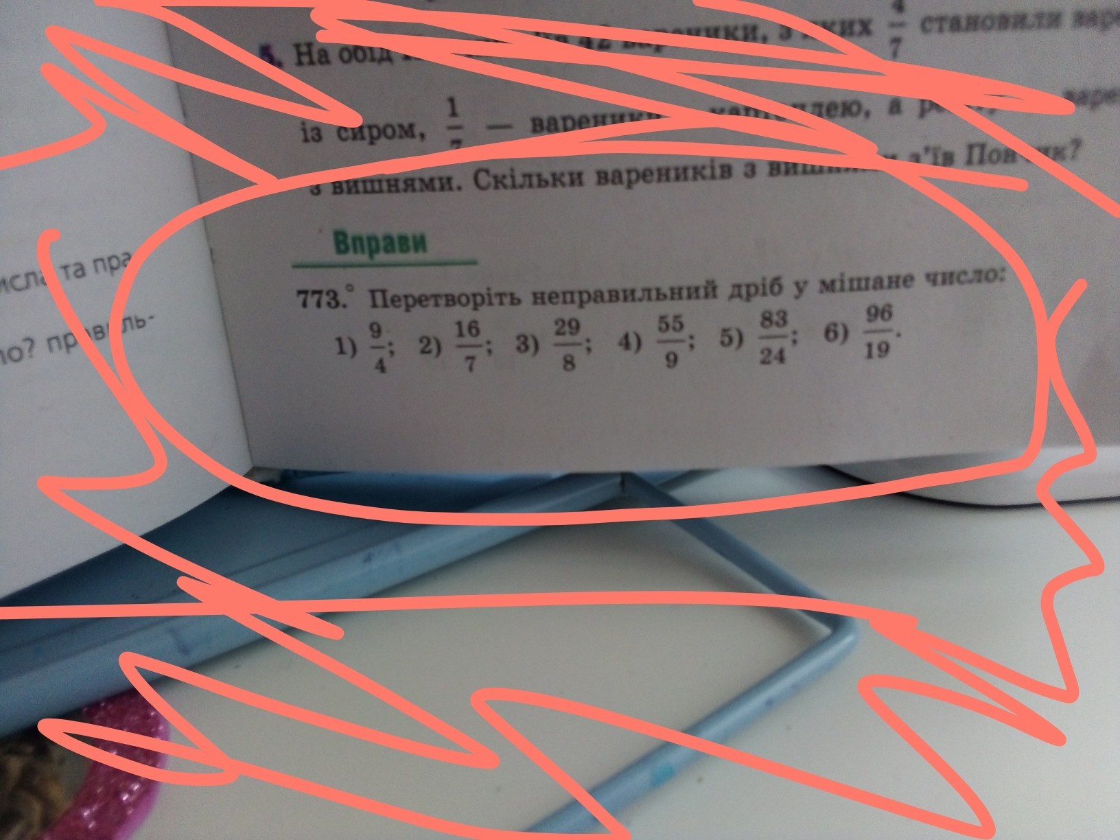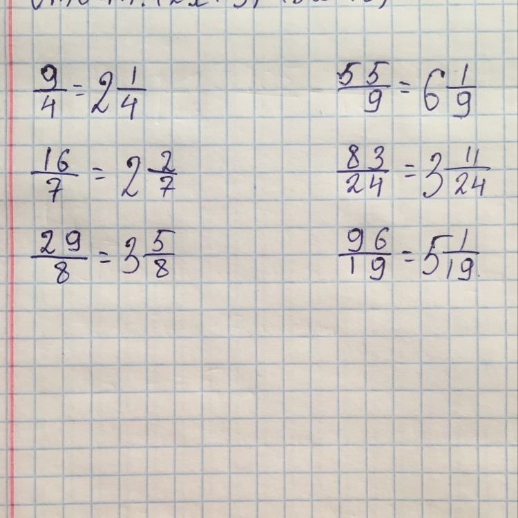 1) 9/4=2 1/4. 2) 16/7=2 2/7. 3) 29/8=3 5/8 4) 55/9 = 6 1/9. 5) 83/24= 3 11/24. 6) 96/19 =5 1/19.