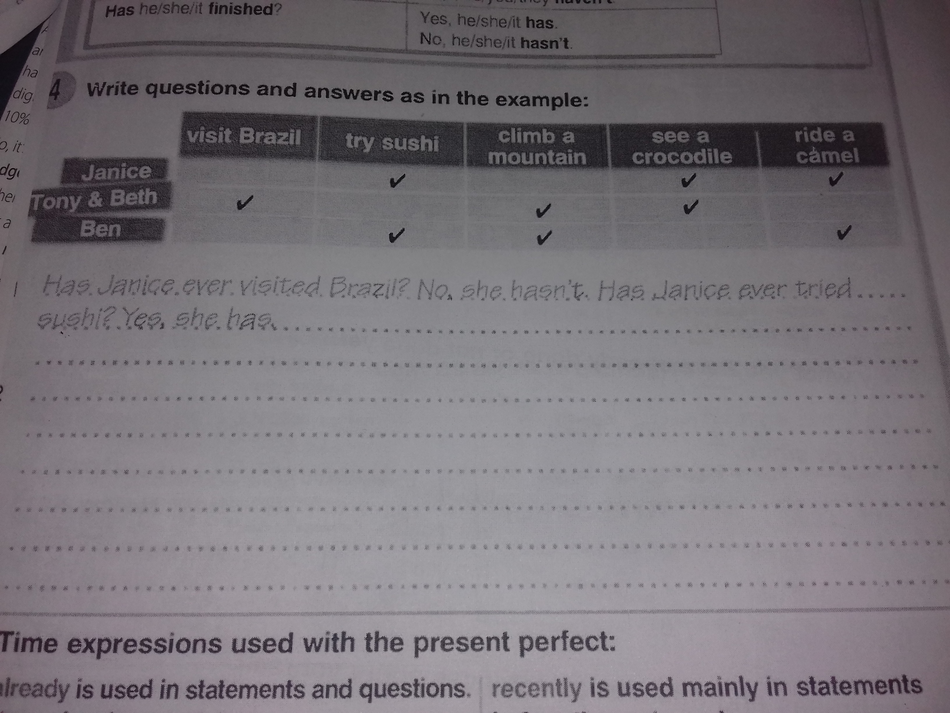Has Janice ever climbed a mountain? No,she hasn't. Has Janice ever saw a crocodile? Yes,she has.Has Jancie ever rode a camel? Yes,she has.