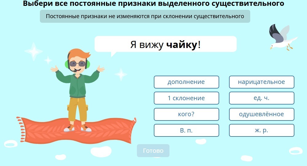 Постоянные признаки "чайку" - ж.р., 1 скл., одушевлённое, нарицательное.
