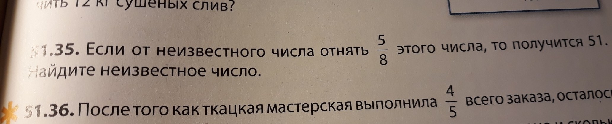 Если от неизвестного числа отнять 5/8 этого числа, то получится 51. Найдите неизвестного число.